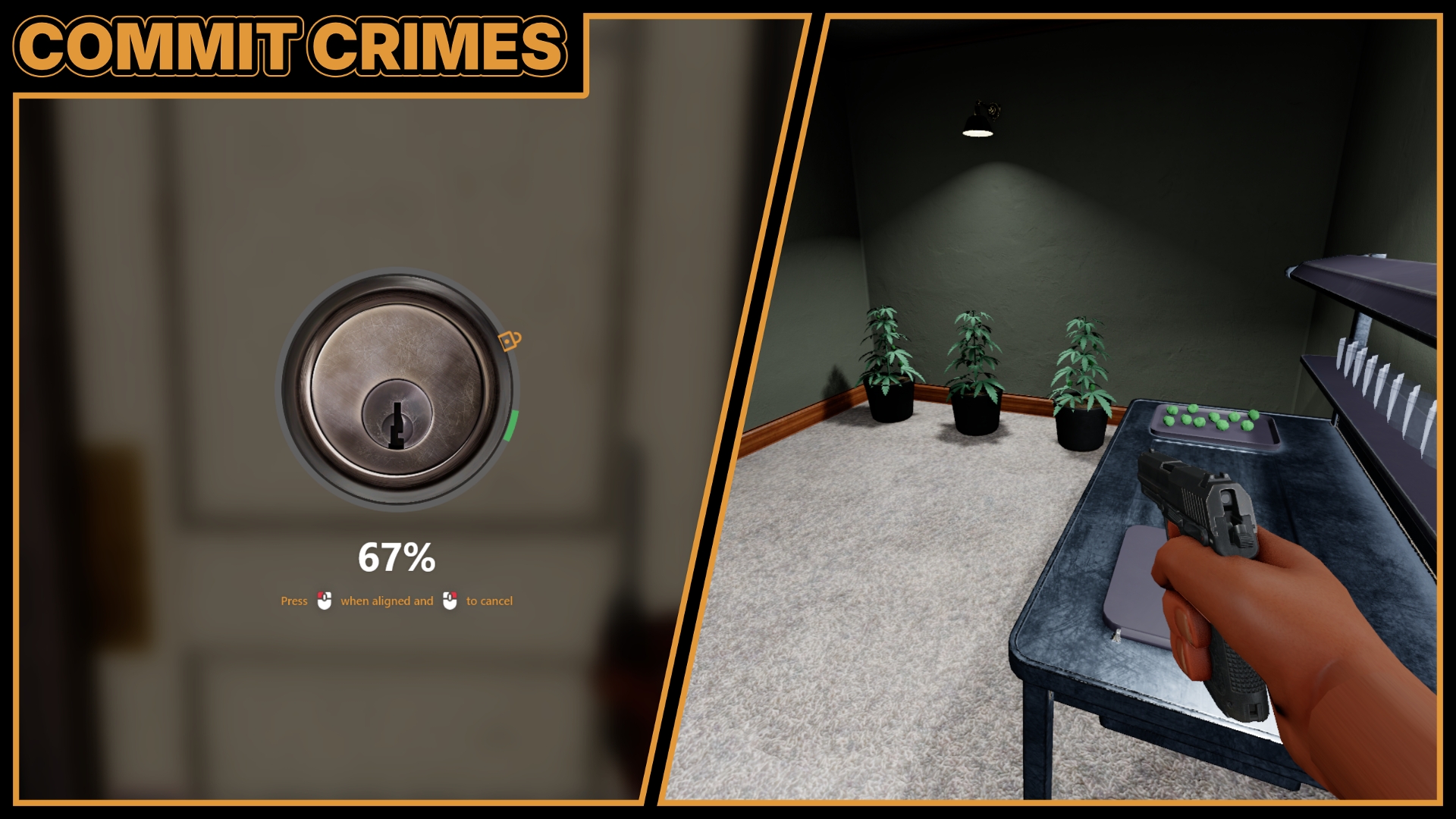 - Break into properties, steal, and take risks for bigger rewards