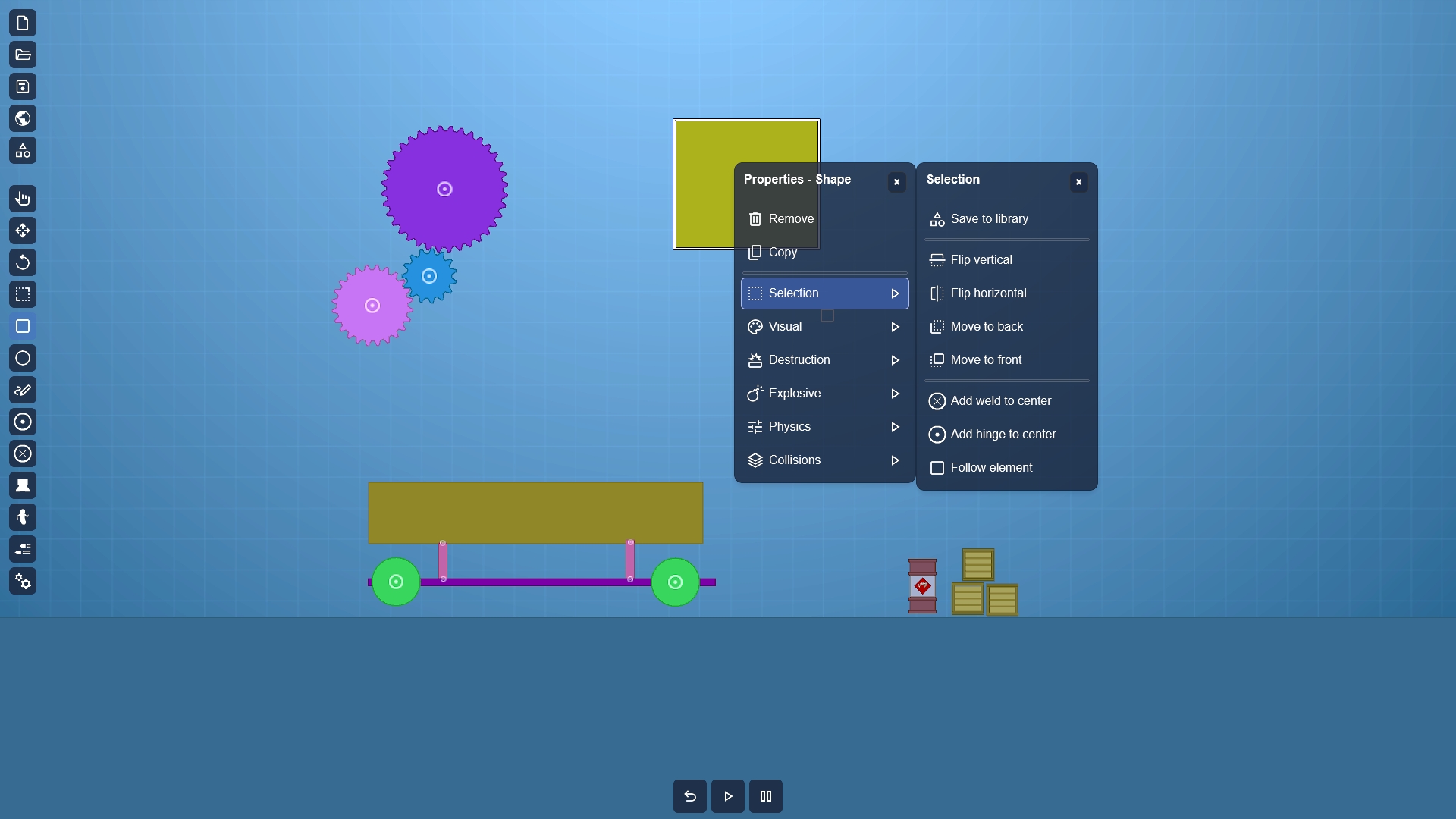 Shapes can be customized to be destructible by using properties in the context menu under the Destruction tab. Some shapes can be made explosive, while others can be made breakable.