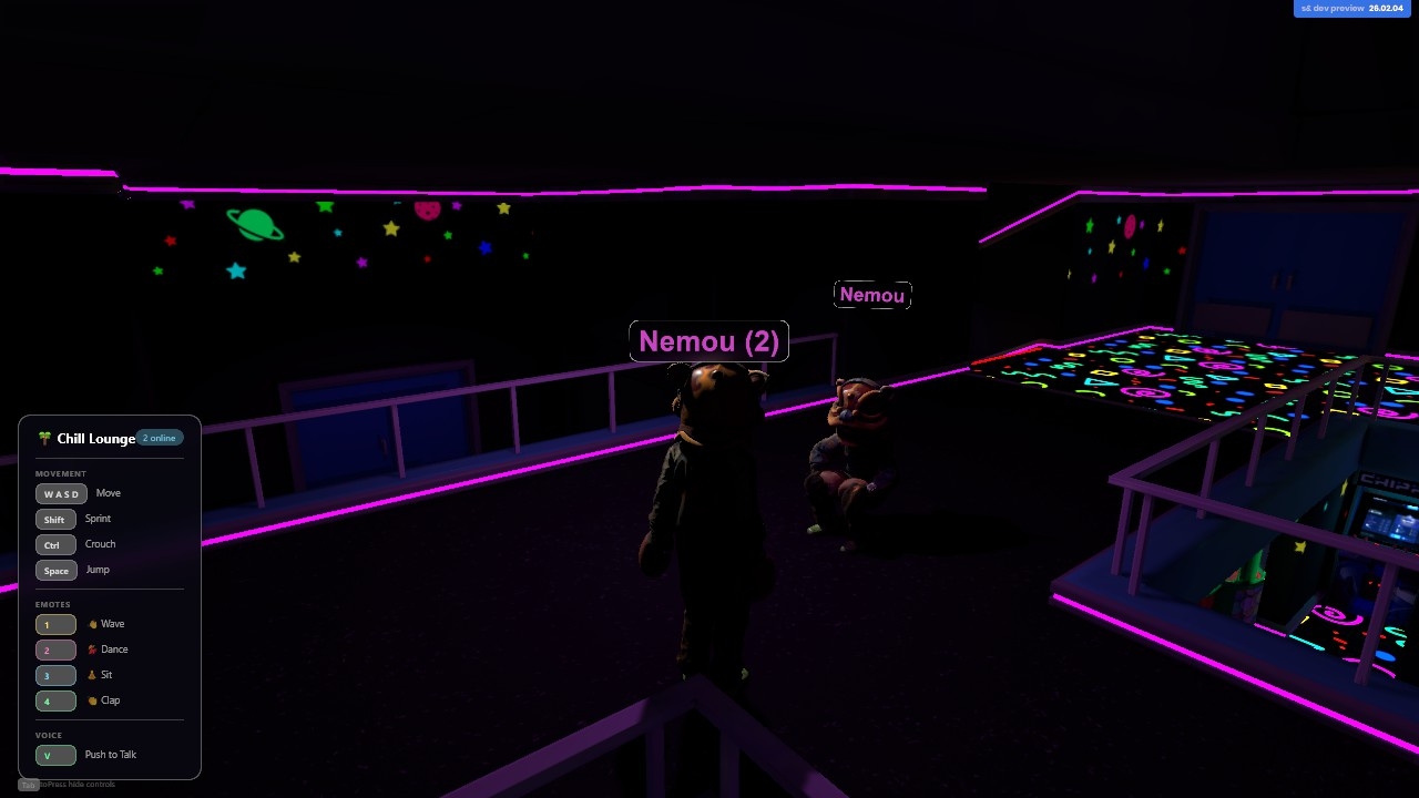 A multiplayer social hangout — emote, dance, voice chat, and vibe
