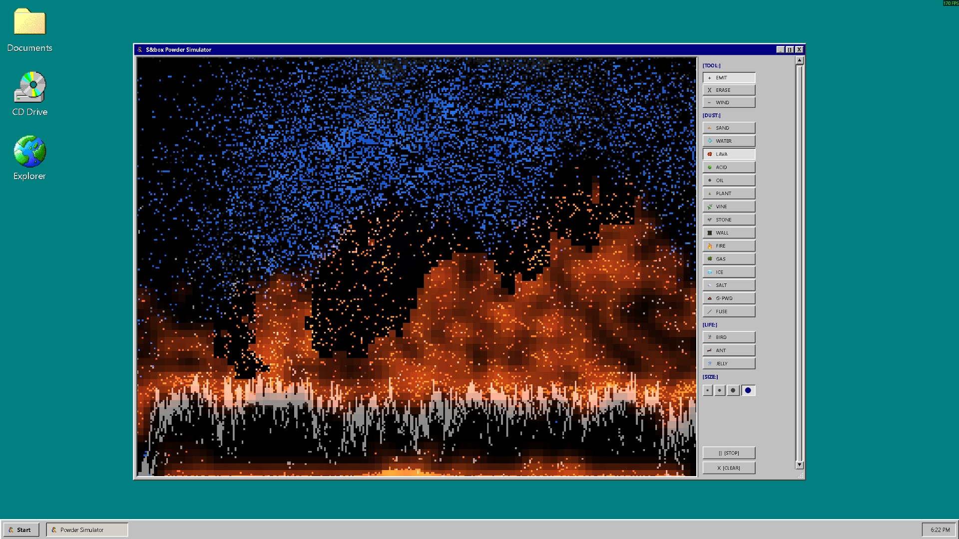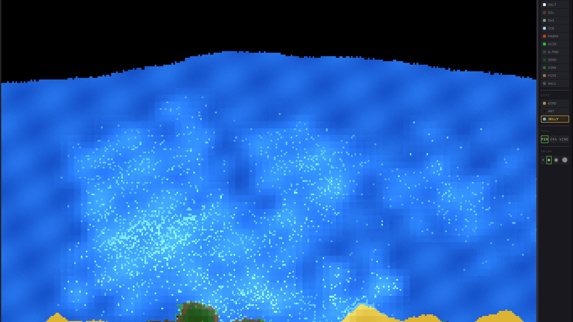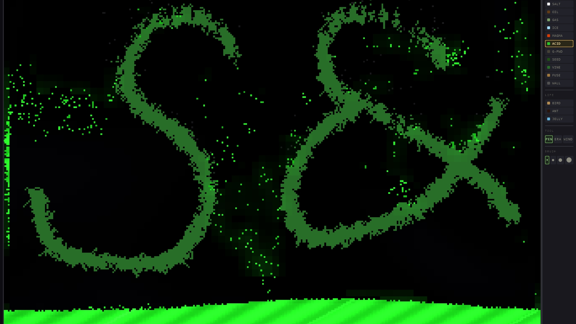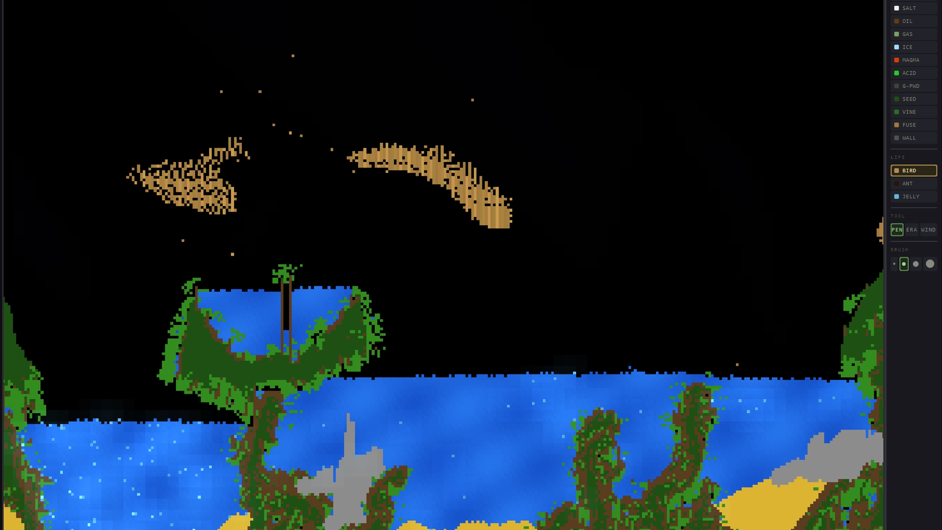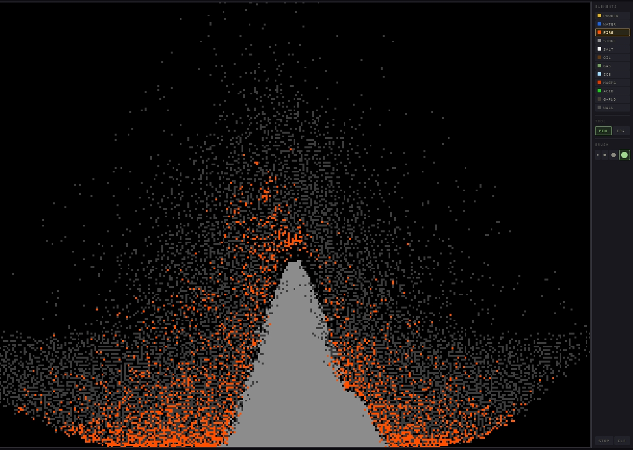 A classic falling-sand simulation. Drop powder, pour water, spark fire, and watch elements interact in a pixelated sandbox. Sand sinks through water, lava turns rivers to steam, acid dissolves everything in its path, and one spark can set off a chain of gunpowder explosions. Draw, erase, experiment. There are no goals, just physics and chaos.