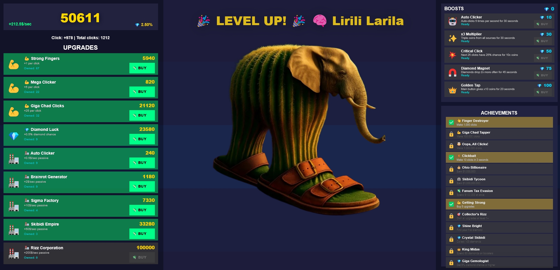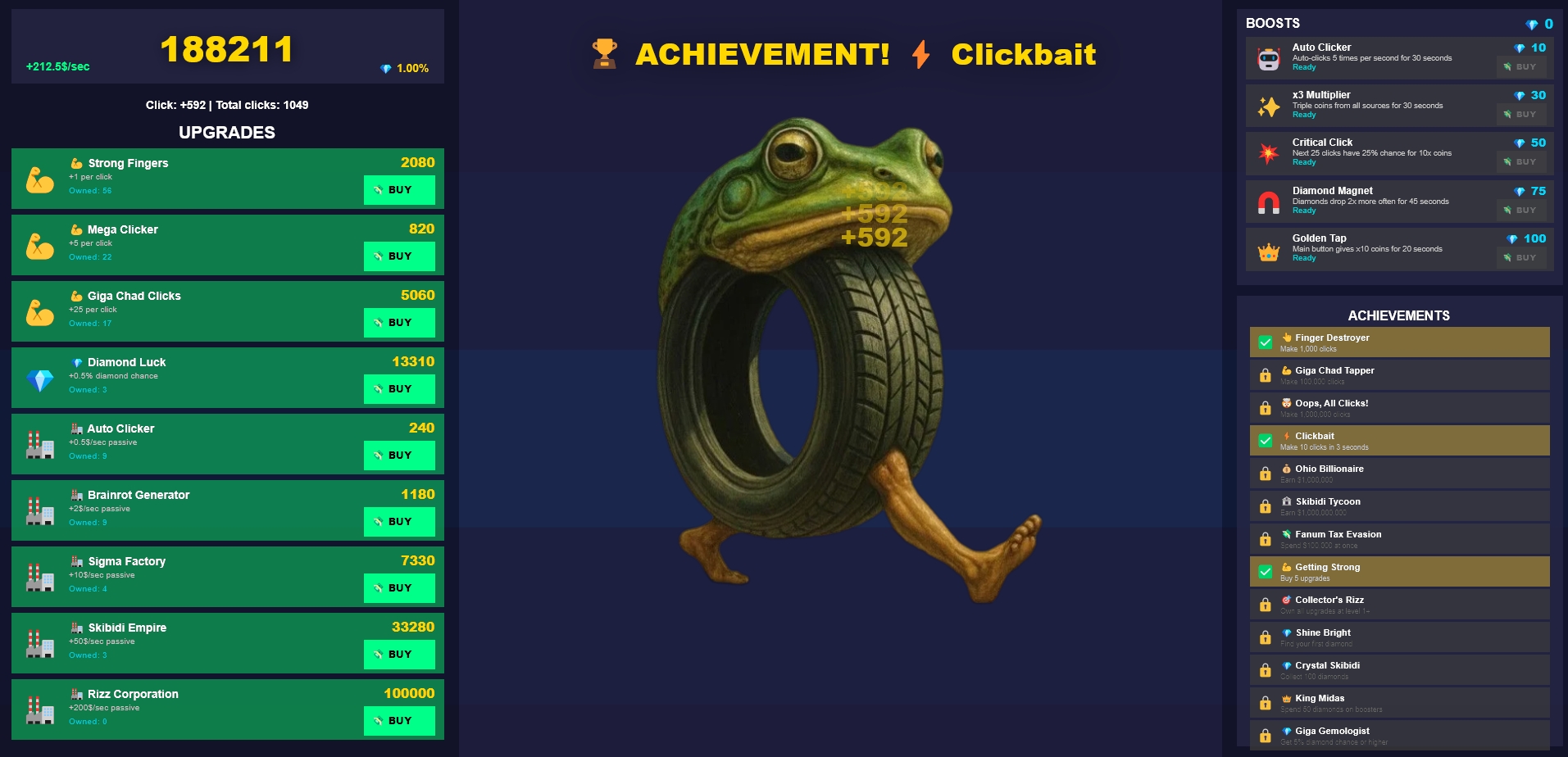- 5 diamond boosts (Auto Clicker, x3 Multiplier, Critical Click, Diamond Magnet, Golden Tap)