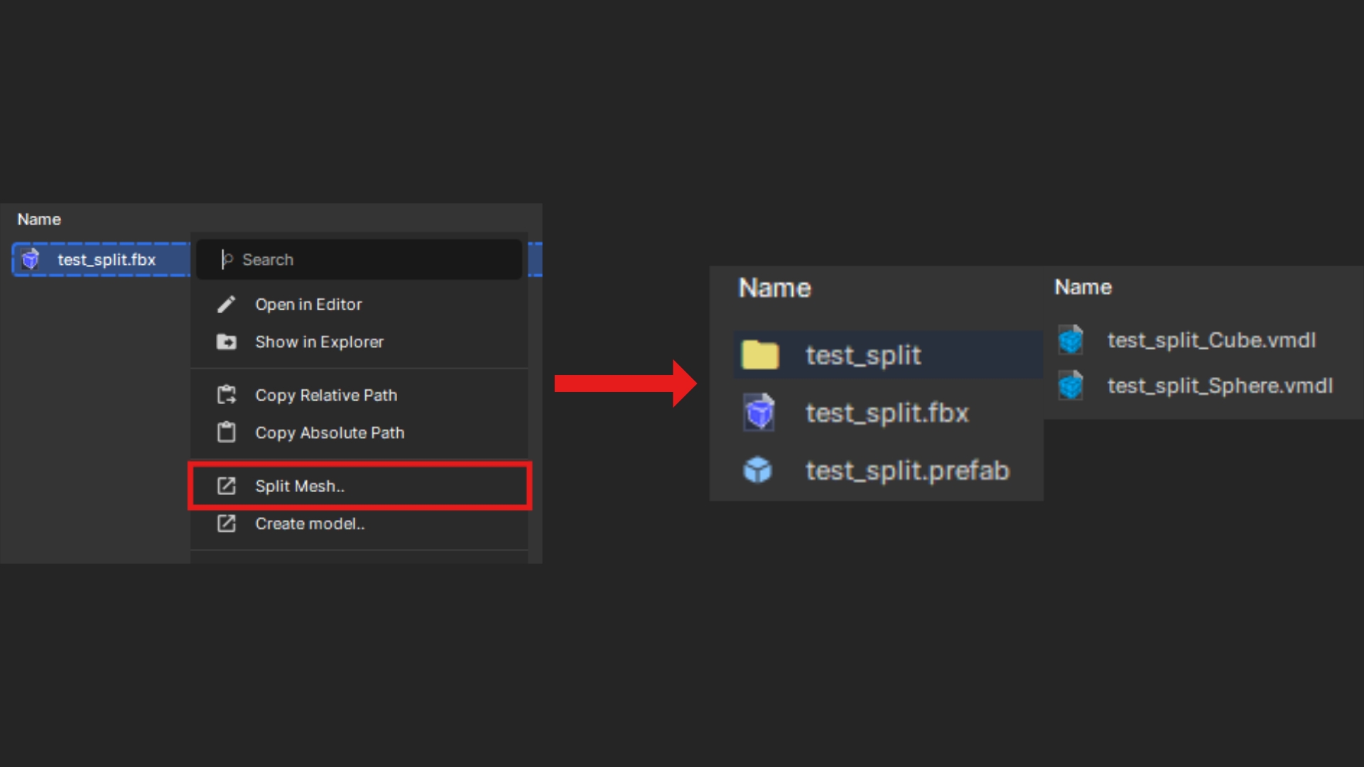 To use the library, right-click a mesh file in your Assets/models folder, and an option called Split Mesh should appear. This will prompt you to select a location for the resulting prefab, and the model files (.vmdl) will be placed in a subfolder with the same name as the initial mesh file.