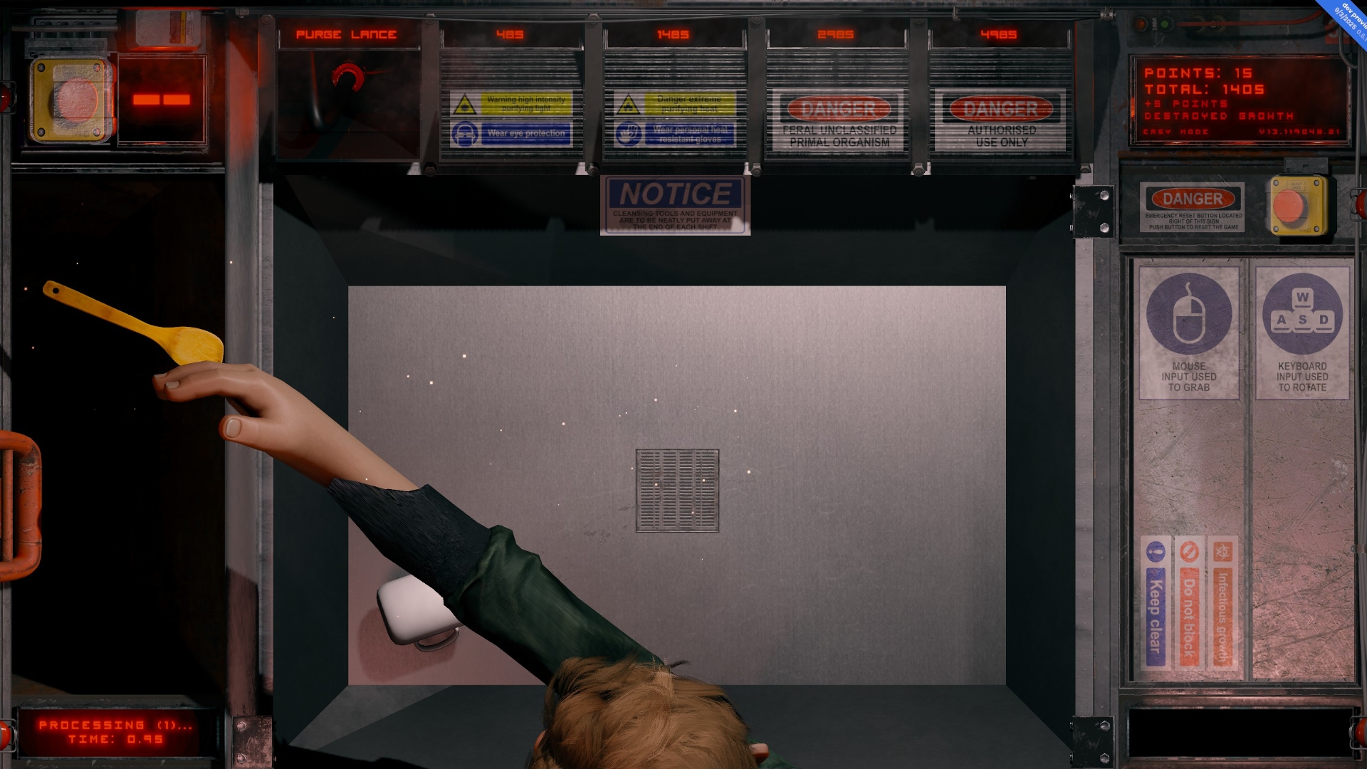 Retrieve infected objects from the right. Cleanse them in the sink using any authorized tools from the top of the screen. Once purity is restored, deliver the objects to the left for processing. Complete each cycle within 33 seconds or the infection will propagate beyond containment. Continue until instructed otherwise. Compliance is mandatory.