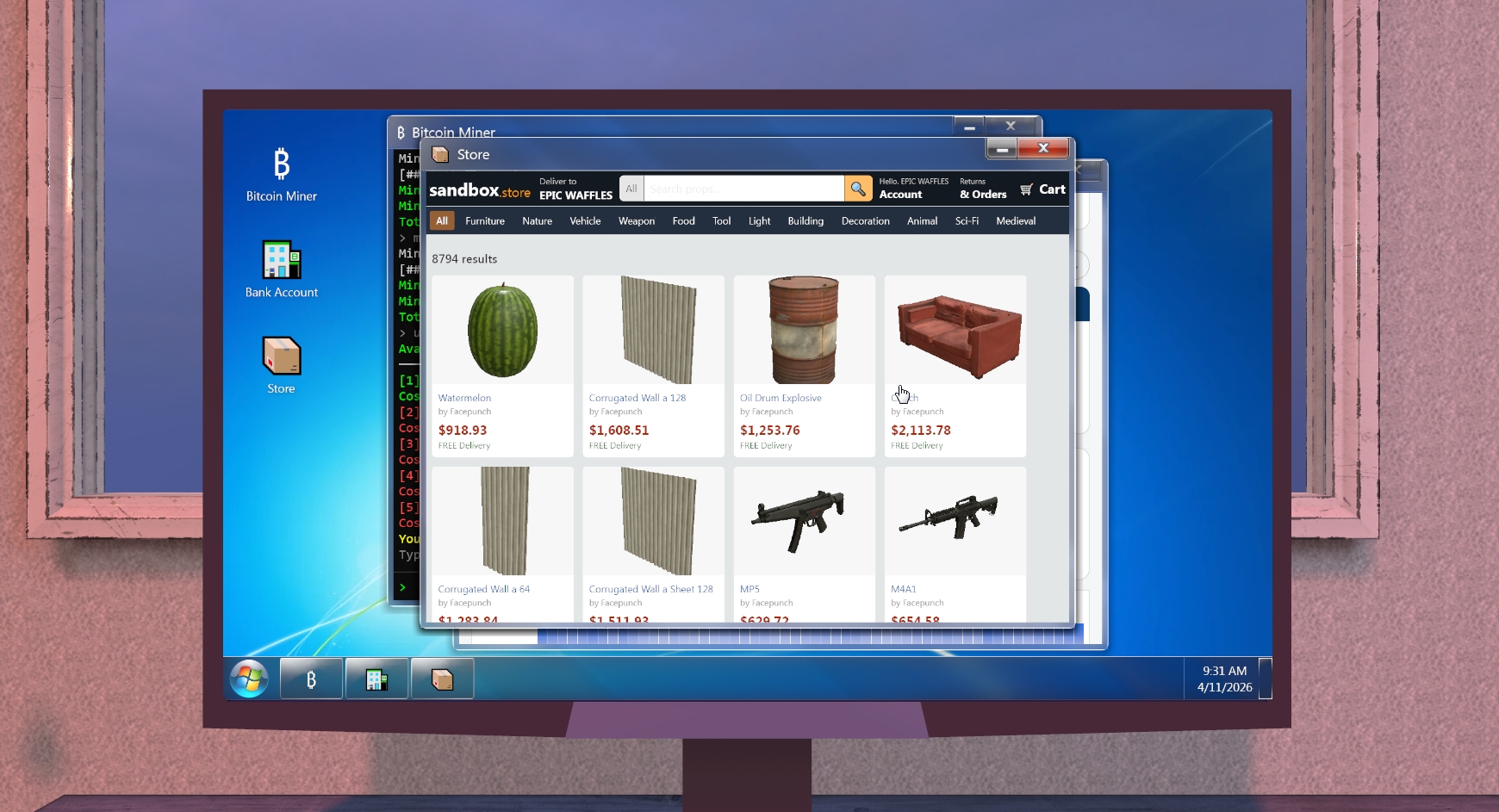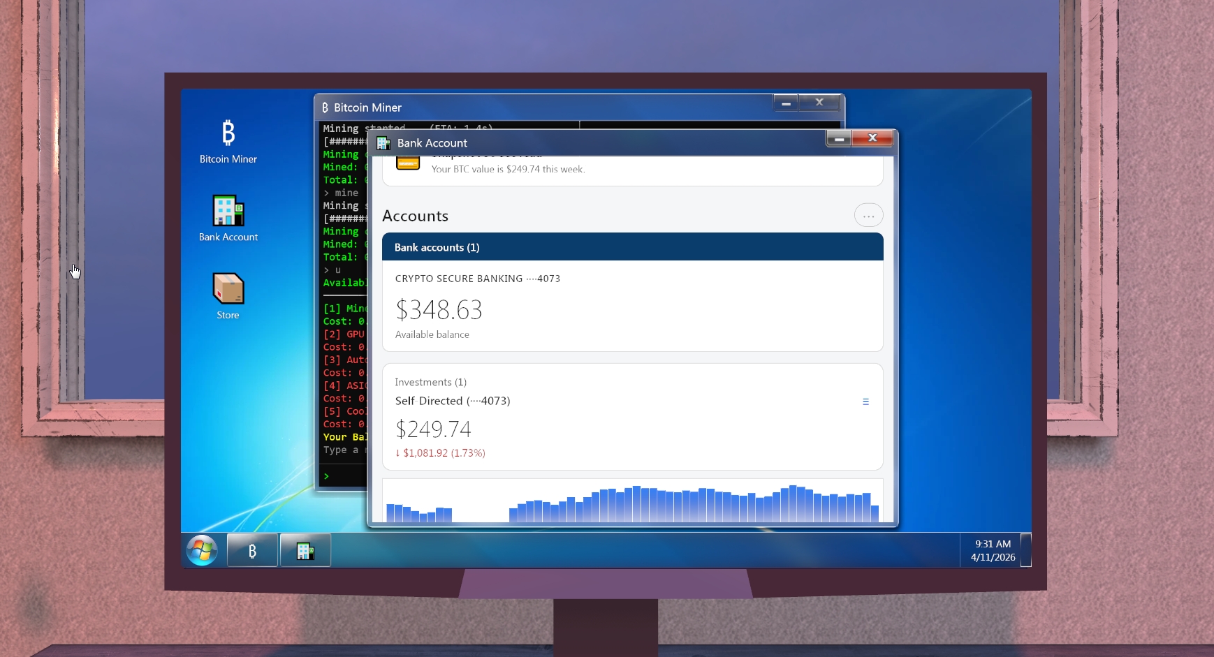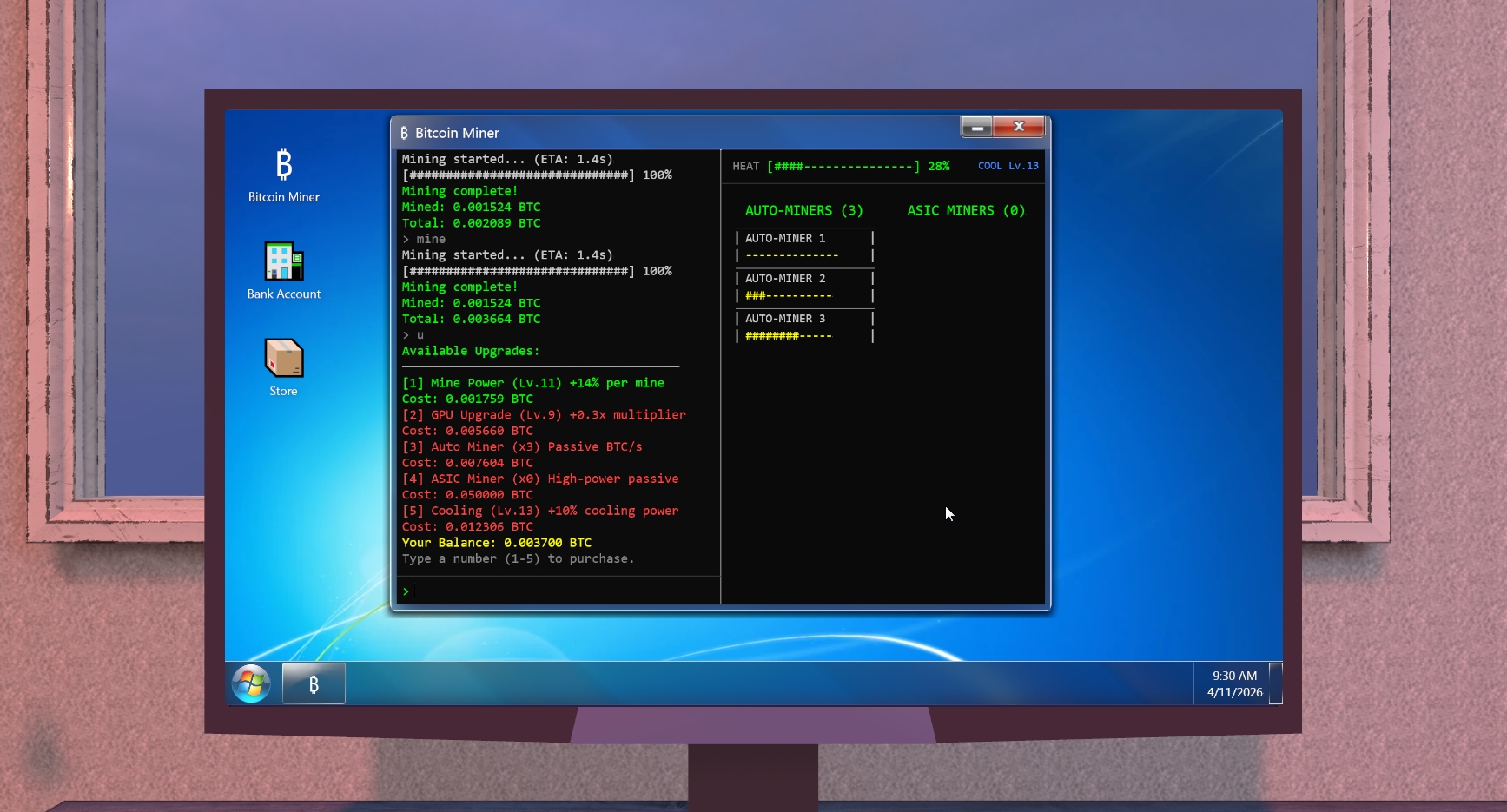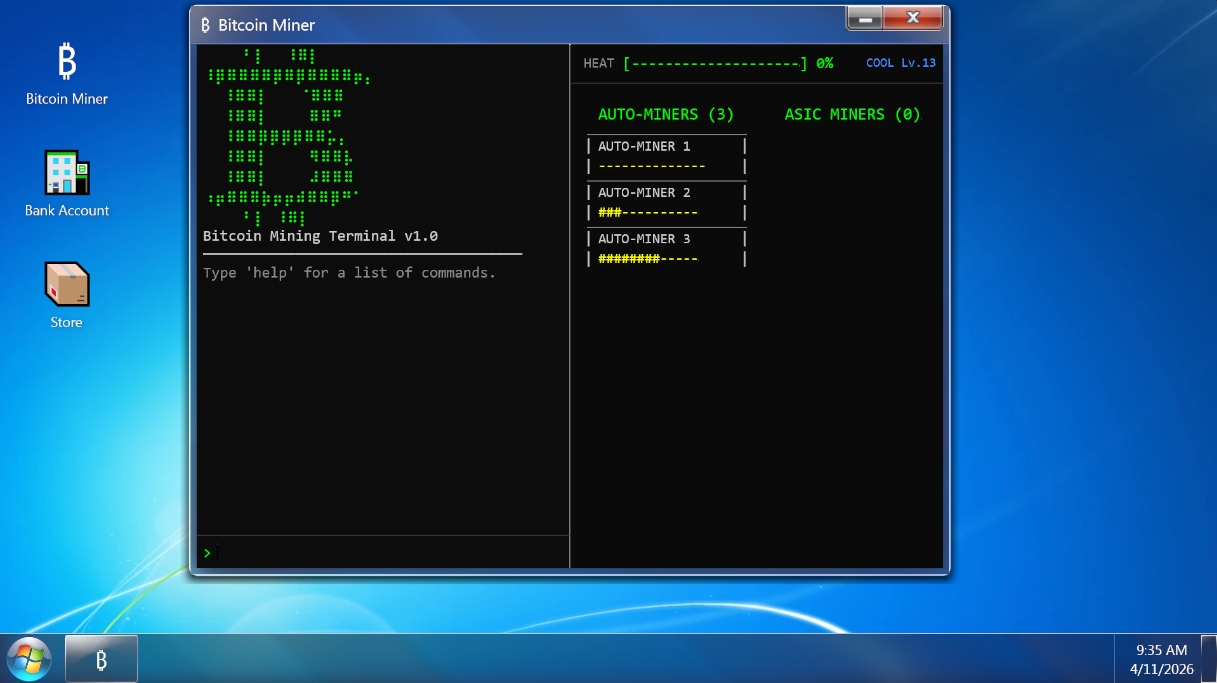 Mine crypto, buy upgrades, and decorate your room. Crypto Simulator is a clicker idle game where you sit down at your Windows 7 computer, fire up the terminal, and start mining Bitcoin. Earn BTC, convert it to USD at the bank, and spend your money on upgrades like faster GPUs, auto-miners, ASIC rigs, and cooling systems to keep your setup from overheating.