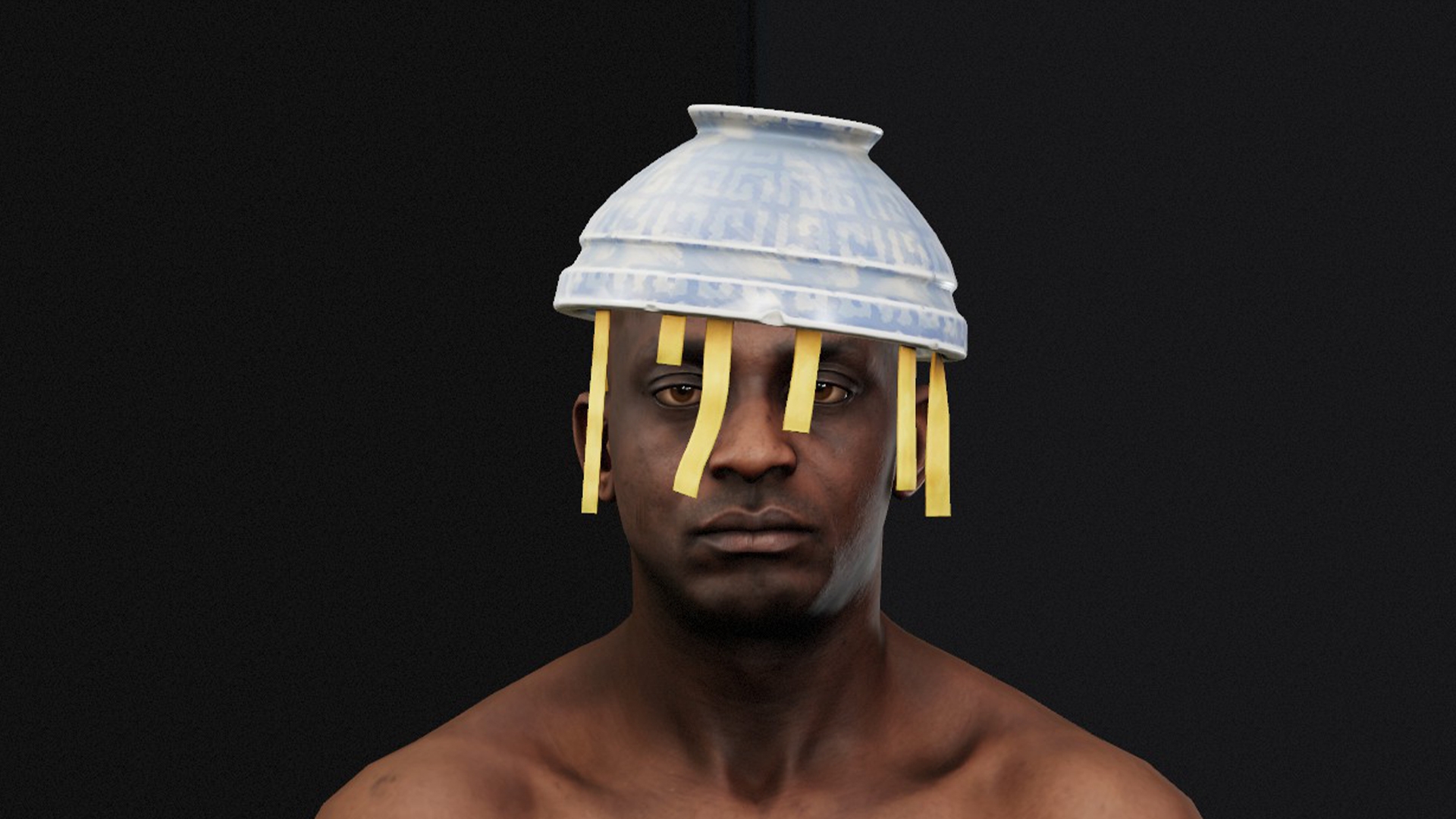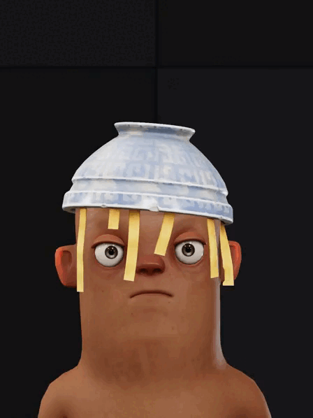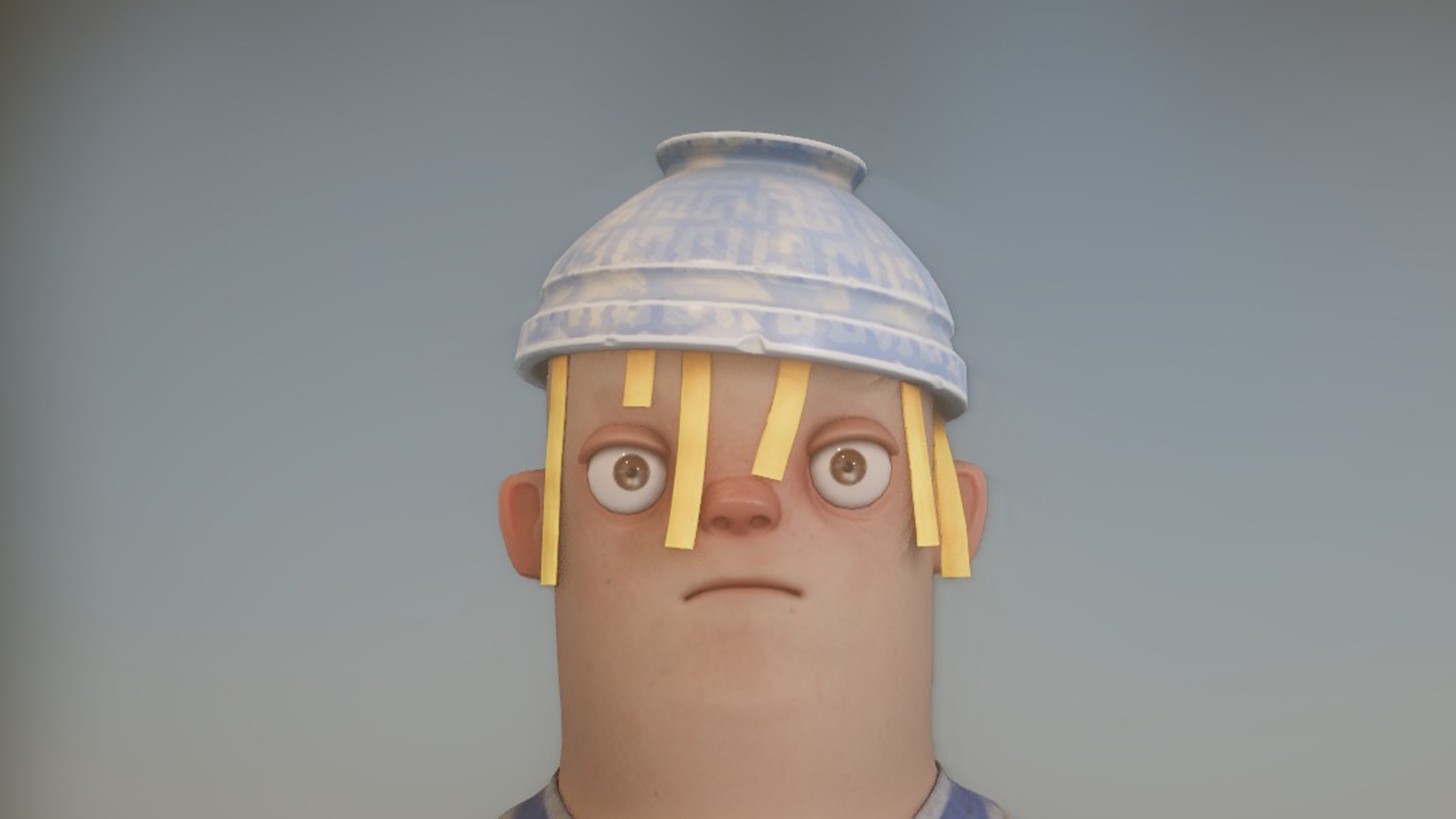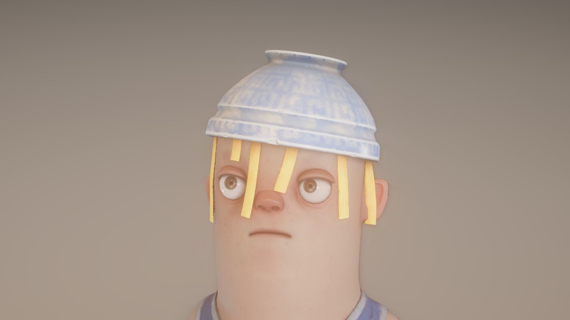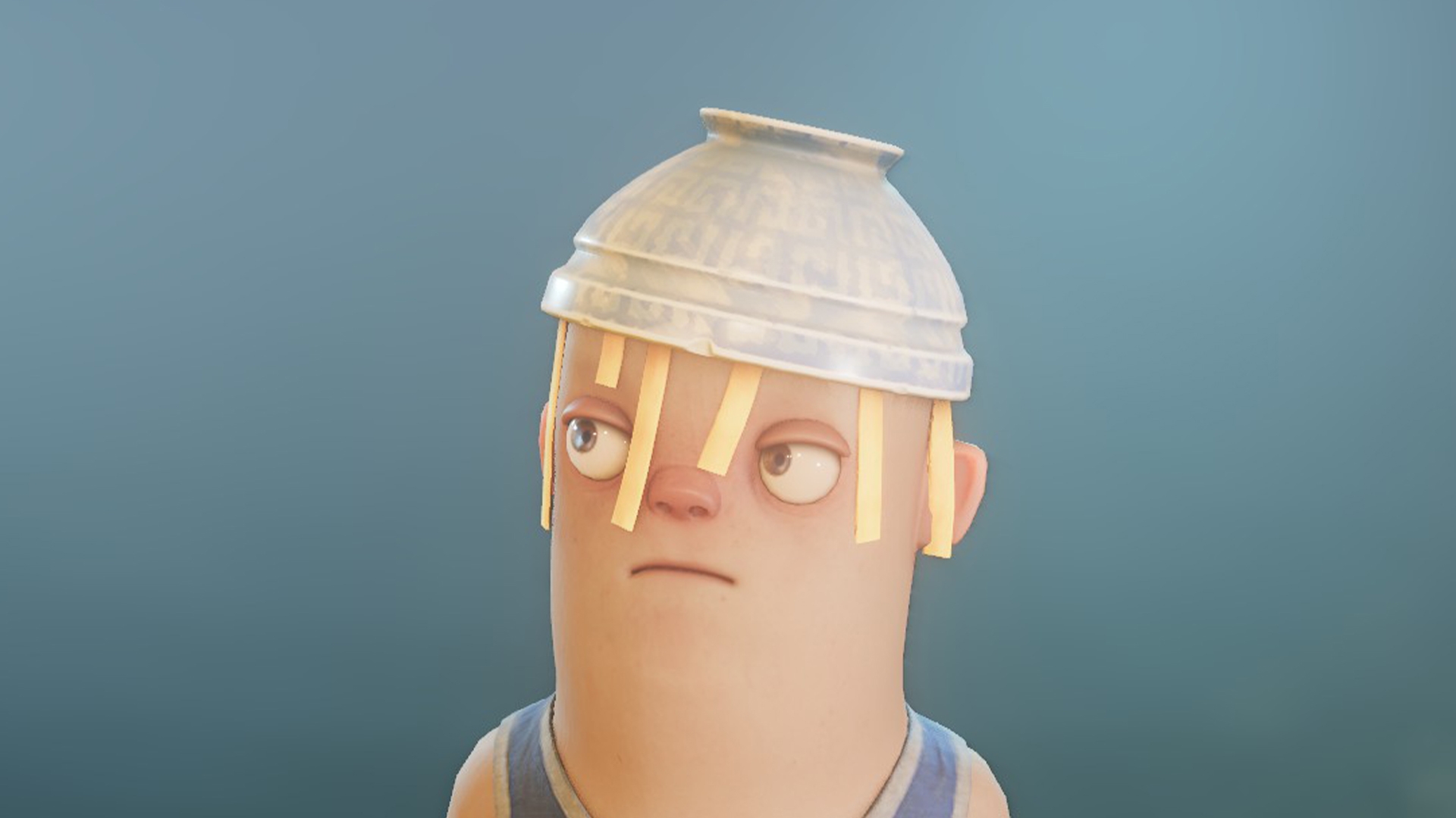 A bowl with a sphaggetti... used as a hat