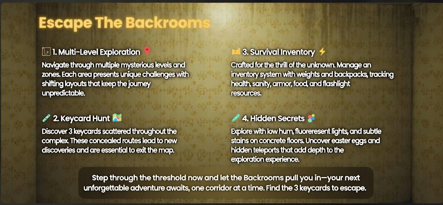 An atmospheric Backrooms exploration experience where endless corridors stretch into silence — and something may be watching.