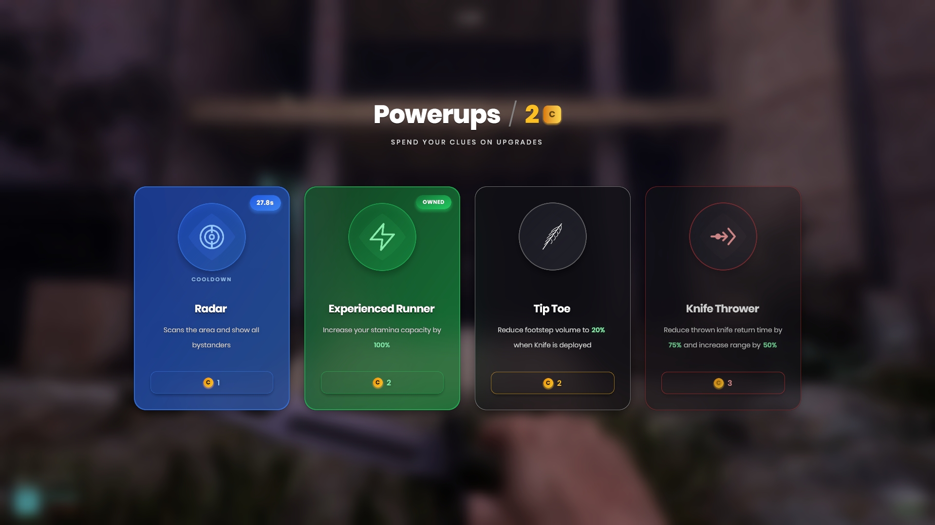 Murderers must collect clues for the ability to disguise as slain bystanders, purchase powerups, and deny the bystanders clues!