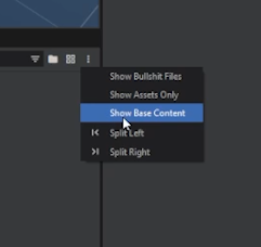 Make sure to turn on 'Show Base Content'. This will allow you to see important 'core' folders and files in the asset browser, which you will be using during the clothing creation process.