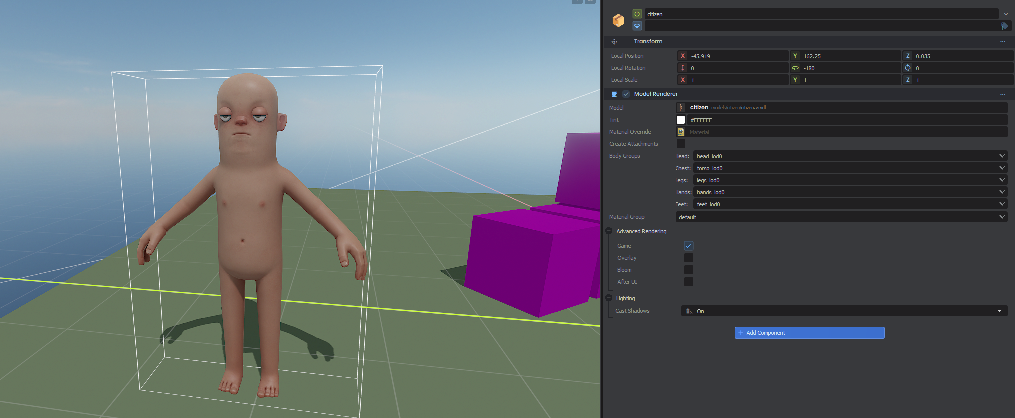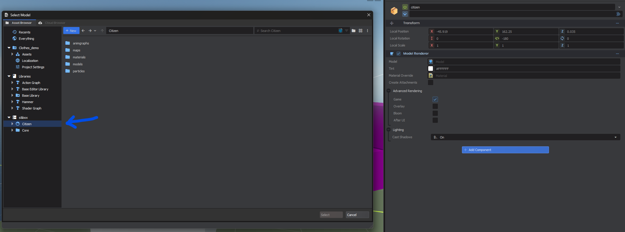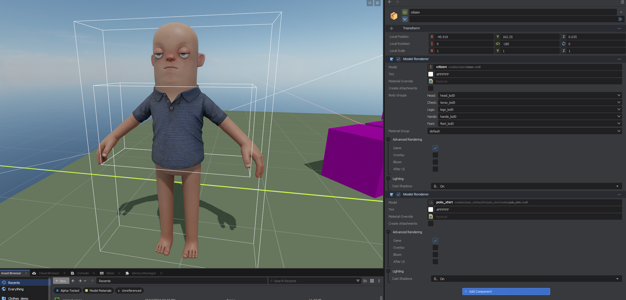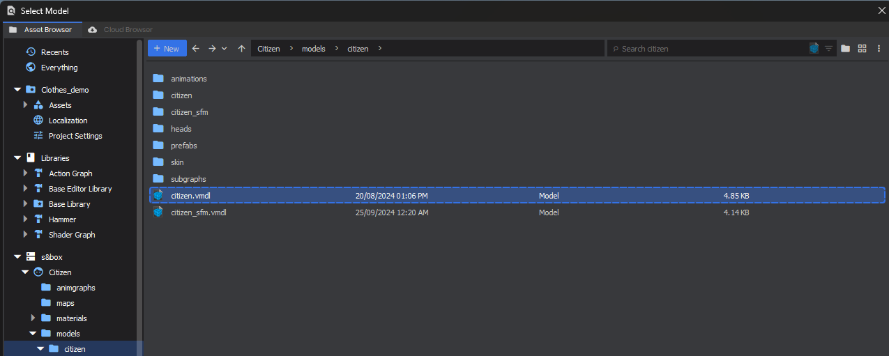 Head to citizen\assets\models\citizen and click on Citizen.vmdl. Now we have the citizen in our scene to start dressing and testing our clothing.