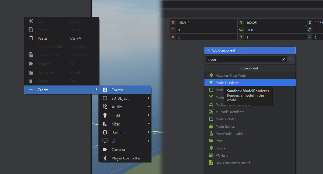 Right click in your 'Hierarchy', add an empty asset. Clicking on this new asset, we can 'Add Component' in the Inspector. Type and click in Model Renderer.