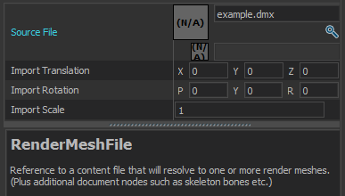 It is recommended you modify location and rotation manually in a separate modelling program. Alternatively, for scale you can use the ScaleAndMirror node for scaling your model. If your mesh is static (not skinned to any bones), you can change its position, orientation, and, scale in the same RenderMeshFile node you used to import the model:
