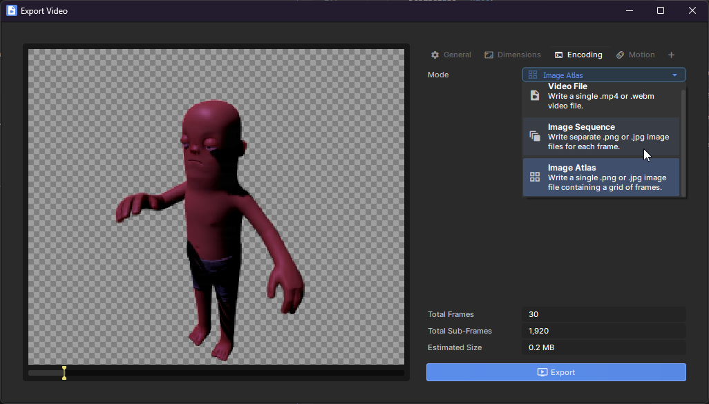 You can also export individual images for each frame of your video, or a single atlas with a tile for each frame. You can find these options in the Encoding tab.