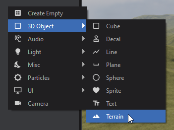 To add Terrain to your Scene, right click in the Hierarchy and select 3D Object → Terrain from the menu.