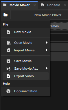 The currently open movie can be exported to a video file using the Export Video.. option in the file menu. This will open a window that lets you tweak the output path, resolution, format, and quality of the exported video.