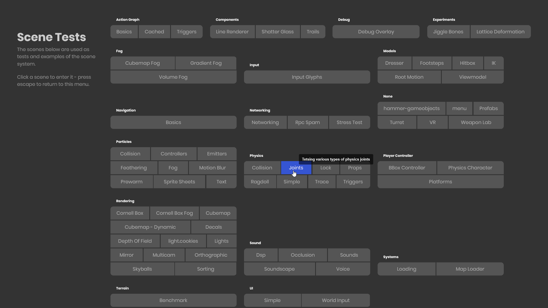 Now we can call GetMetadata(key, fallback) on any SceneFile, so let's create a simple UI that lists out all our Scenes by Title and Group, showing the Description on hover: