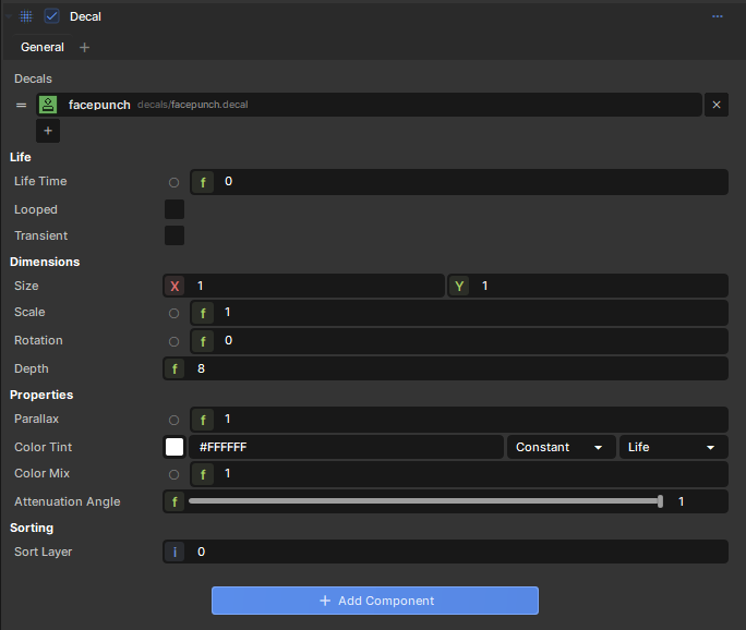 The component is set up so you can create variety in your prefab decals without any extra coding. For example, you can define multiple DecalDefinitions and it'll choose one at random.