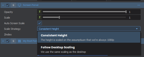 By default, ScreenPanels will rescale all UI based on a 1080p target height automatically. If you wish to disable this, or change the scaling to target the Desktop Resolution, you can change the following: