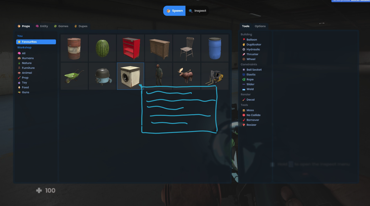 Some things I would love to see possibly in the future, is perhaps a small context menu of model information in the spawn menu. Hovering over a spawnable item and getting some general information like the model bounds size, and if it's damageable, interactable, etc. would be really nice.