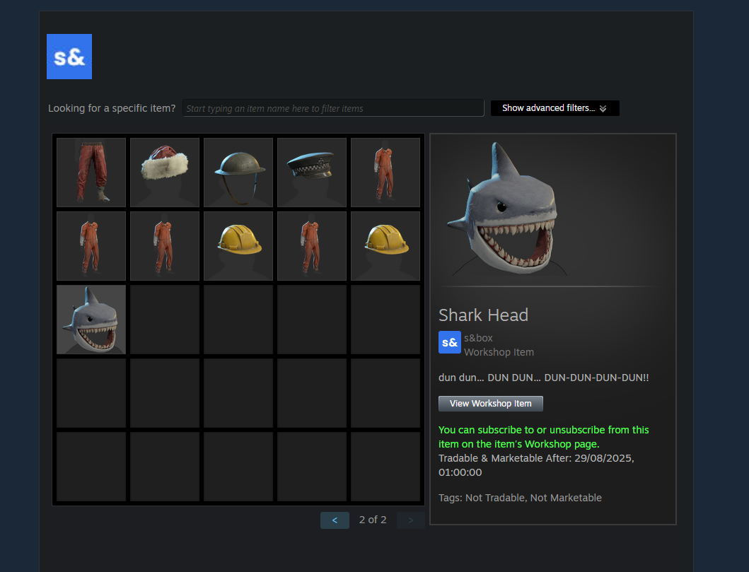 We see the same thing in the Rust workshop ecosystem too. I think I've explained why I chose Shadow's Shark Hat (because it's unique, it's iconic, it's cool, it stands out, it works, I know and trust him, so can work with him to make sure everything works, and because he's been a constant, positive, helpful member of the community). I know people will disagree and say it doesn't fit the art style of the game.. but I think I'm a pretty good judge of what I want and don't want in my game.