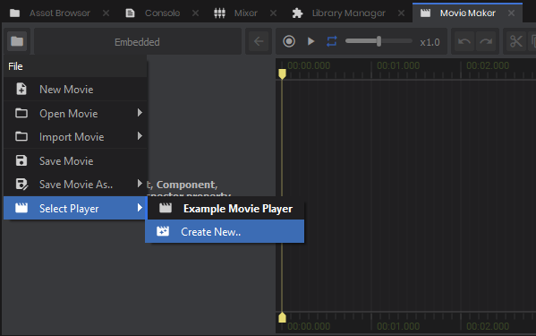 If your scene doesn't have a Movie Player, you can create one using the big button on the Movie Maker startup screen.You can also create new players through the File menu of Movie Maker.