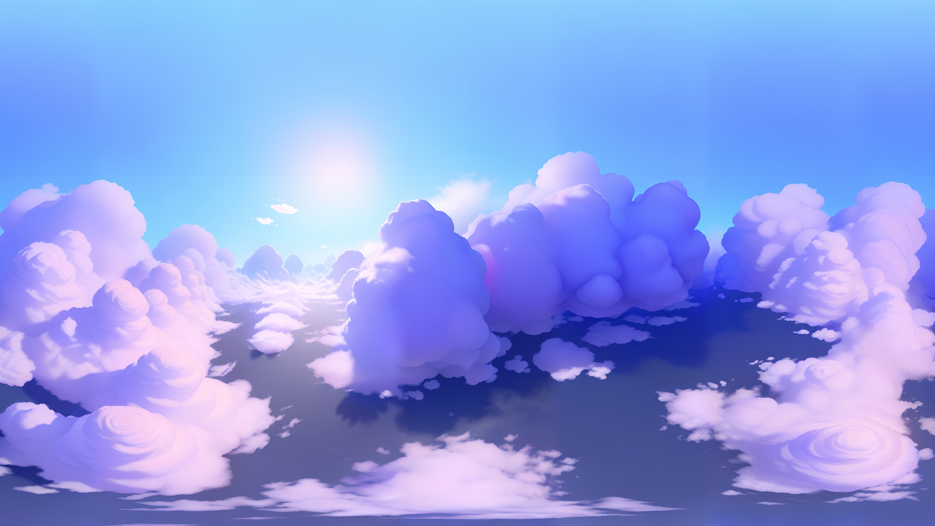 A bright daylight skybox material. Pink/Purple, morning, clear sky, surrounded by clouds, fantasy.