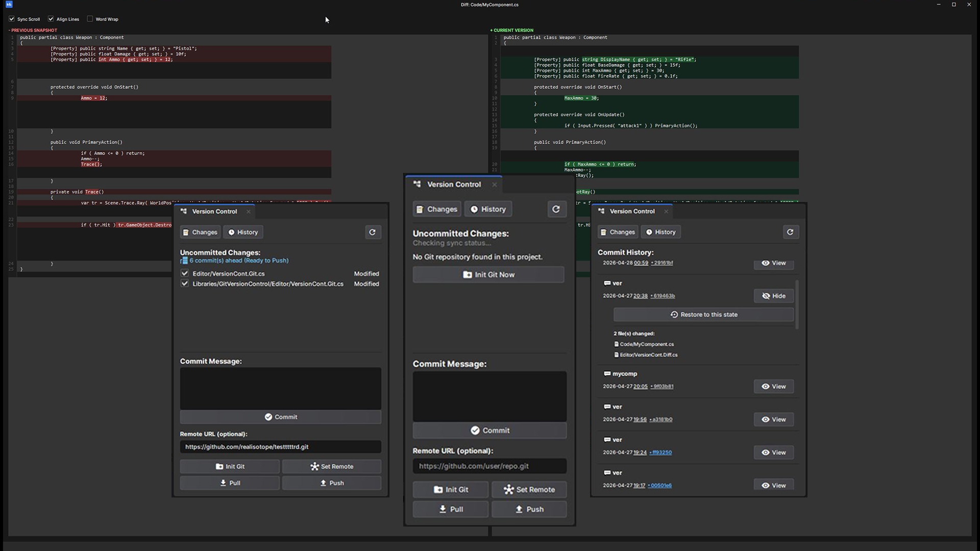 A Visual Git integration panel for s&box editor. This tool allows you to manage your project, compare changes, push/pull to GitHub without ever leaving the editor.