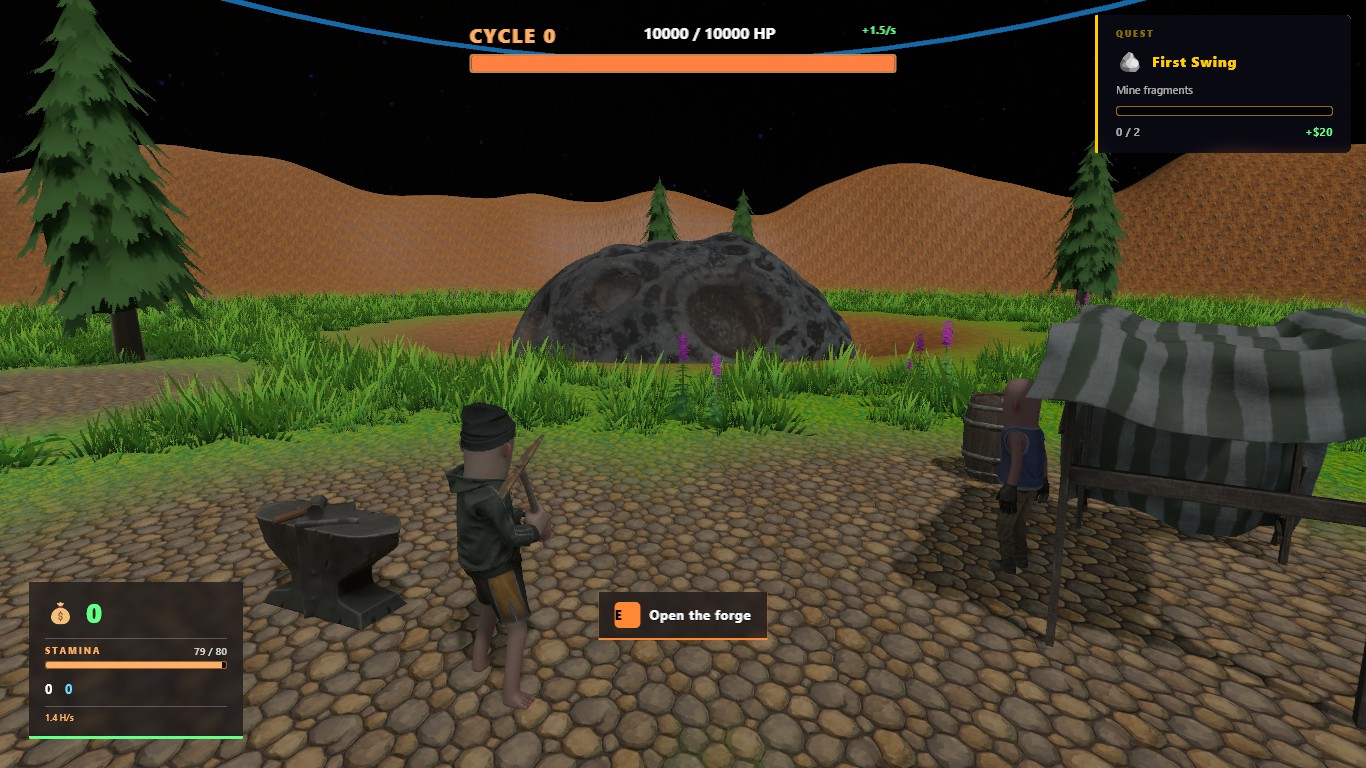 - Unlock better pickaxes at the forge (Wood → Stone → Clay → Gold → Iron → Nickel → Laser)