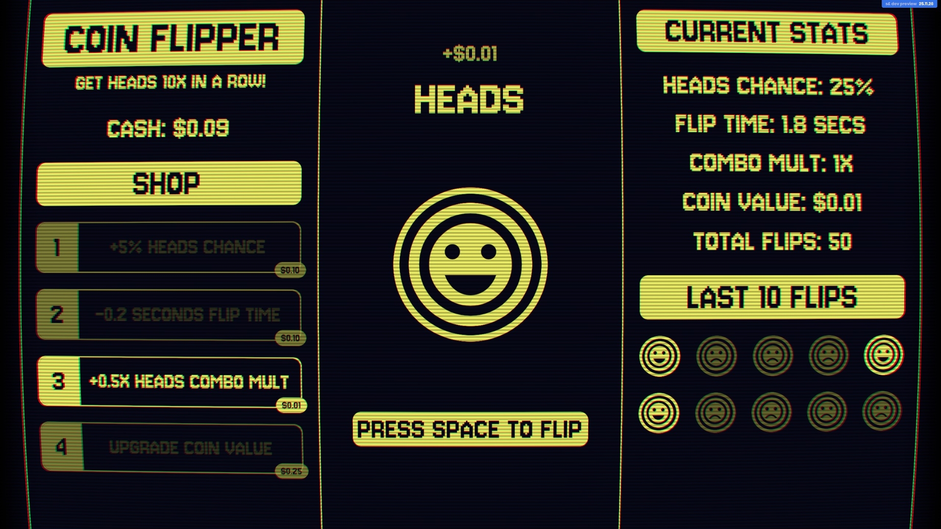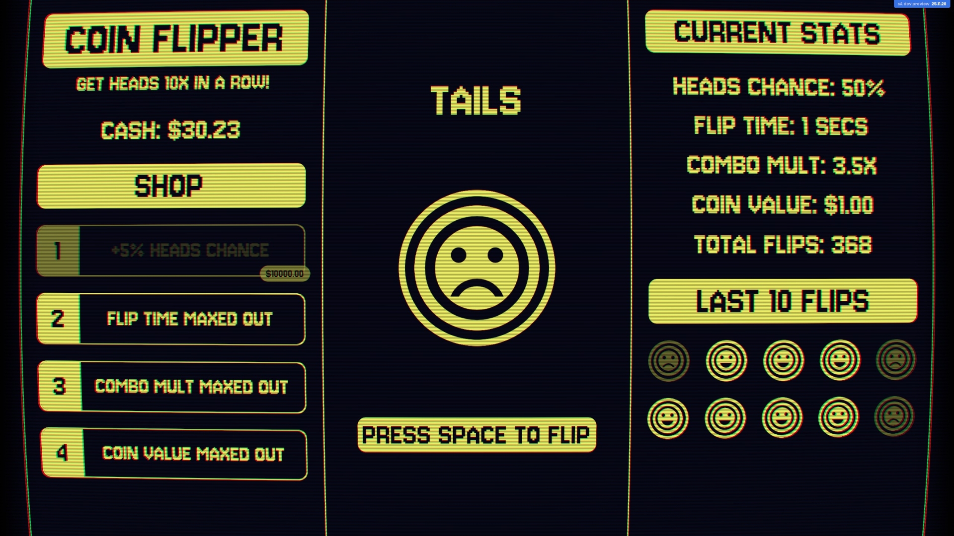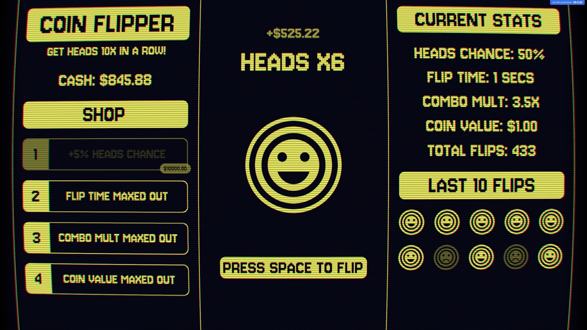 Keep flipping the coin until you land on heads 10 times in a row. Every time you land on heads, you'll earn some cash. Spend this cash on upgrades to make the goal more achievable.
