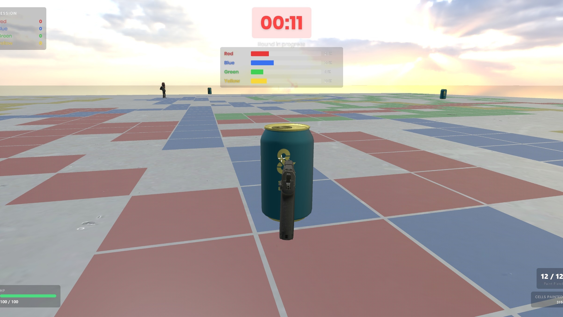 But it's not just about painting — every player carries a pistol. Take down enemies to stop them from painting and send them back to spawn. Stay alive, keep moving, and dominate the map.