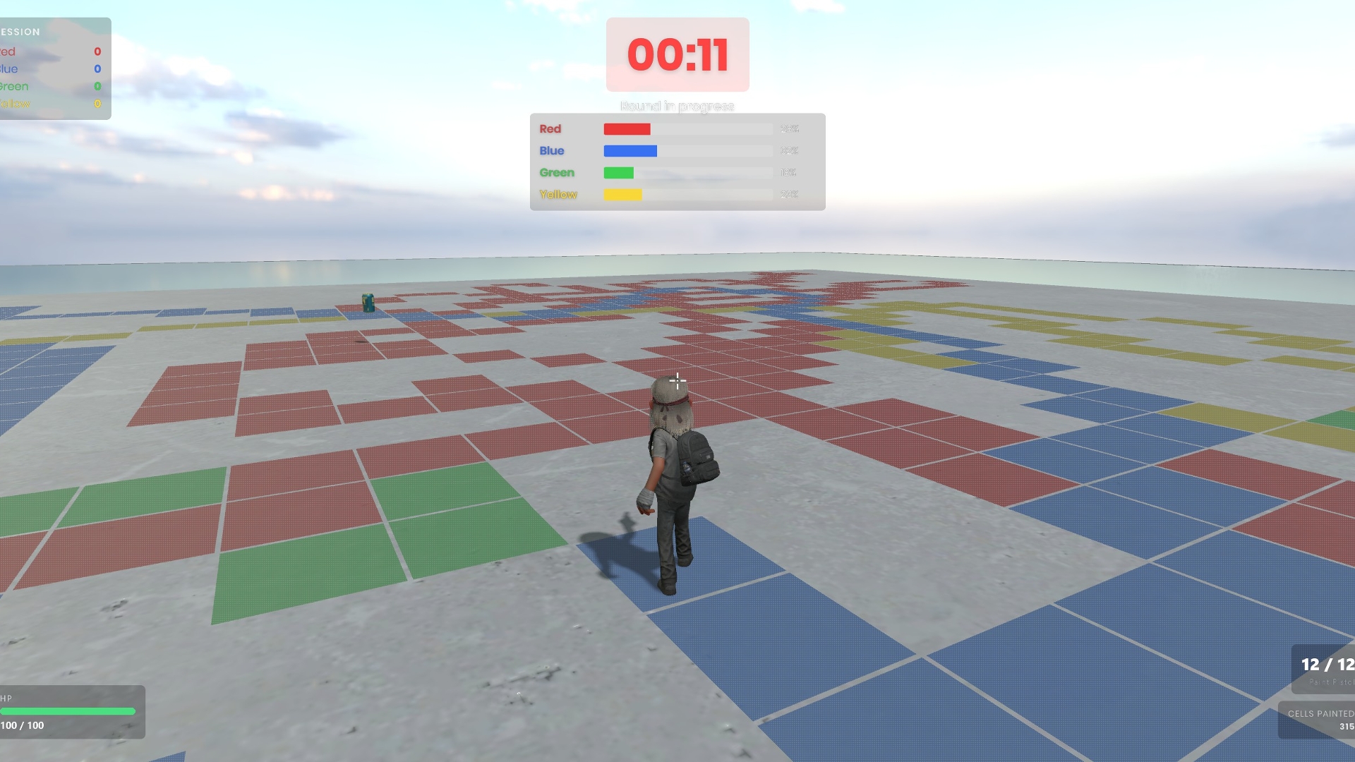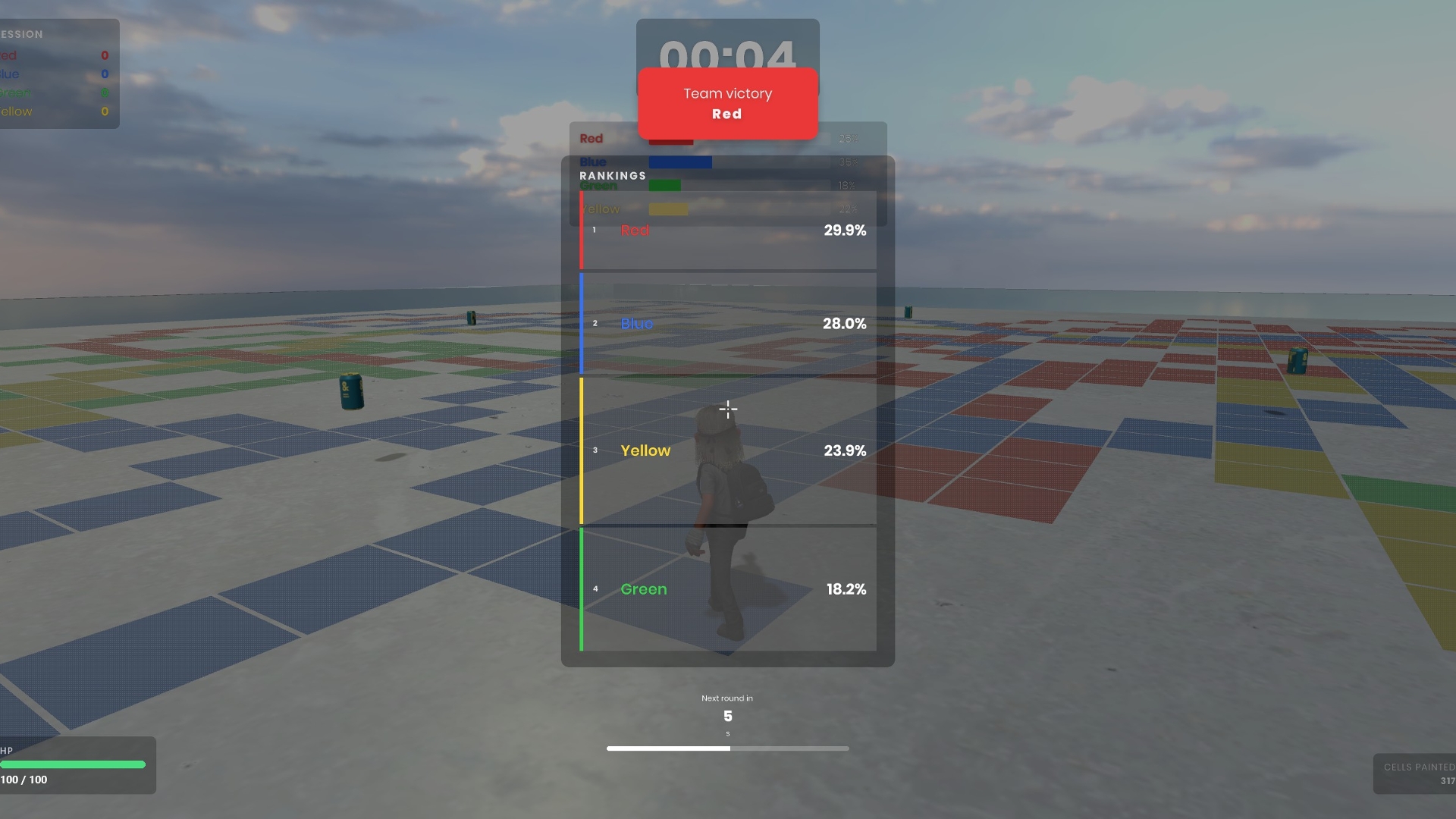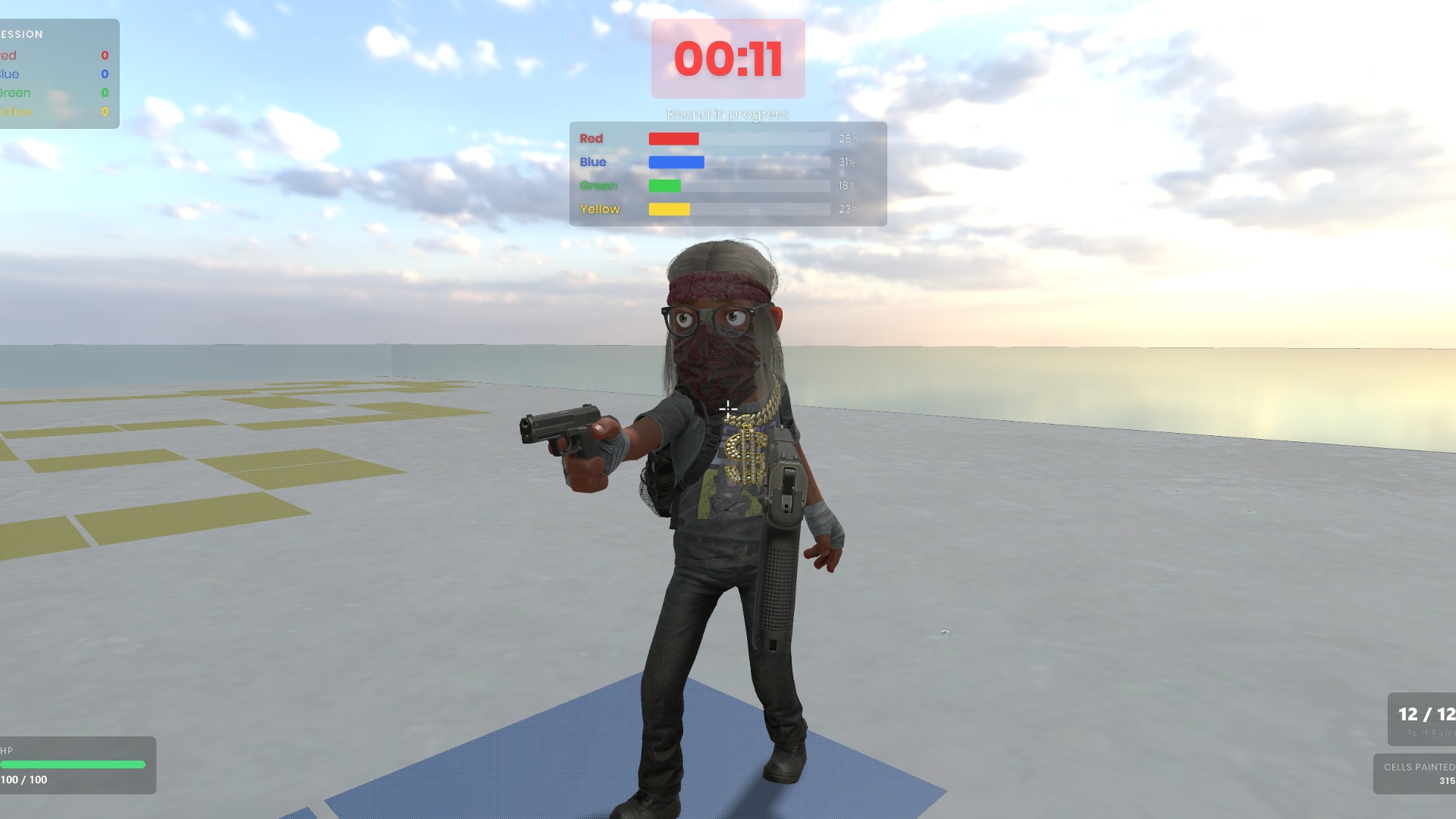 Paint Territory is a fast-paced multiplayer gamemode where teams compete to paint the ground beneath their feet. Run across the map, claim territory for your team, and steal it from the enemy. The team with the most coverage when the timer runs out wins the round.