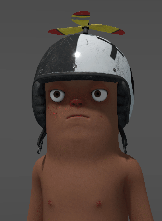 helmet with propeller, propeller spins, straps dangle.