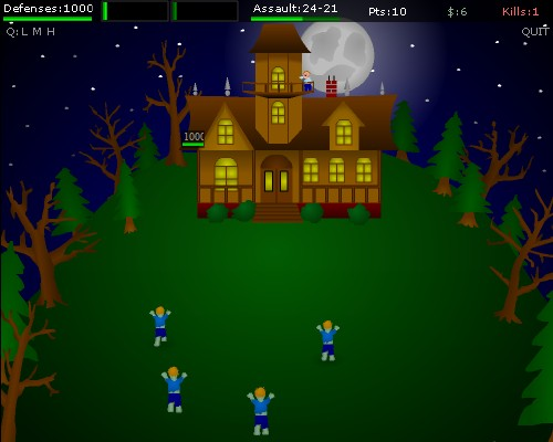 All Hallow's Eve is a very simple game. Your mansion is being attacked at night by zombies and you have to shoot them or they'll break inside and eat you! The perspective is disconnected from your character, you see the mansion and your character atop it, as well as the land surrounding the mansion, allowing you to click on the zombies to shoot them.