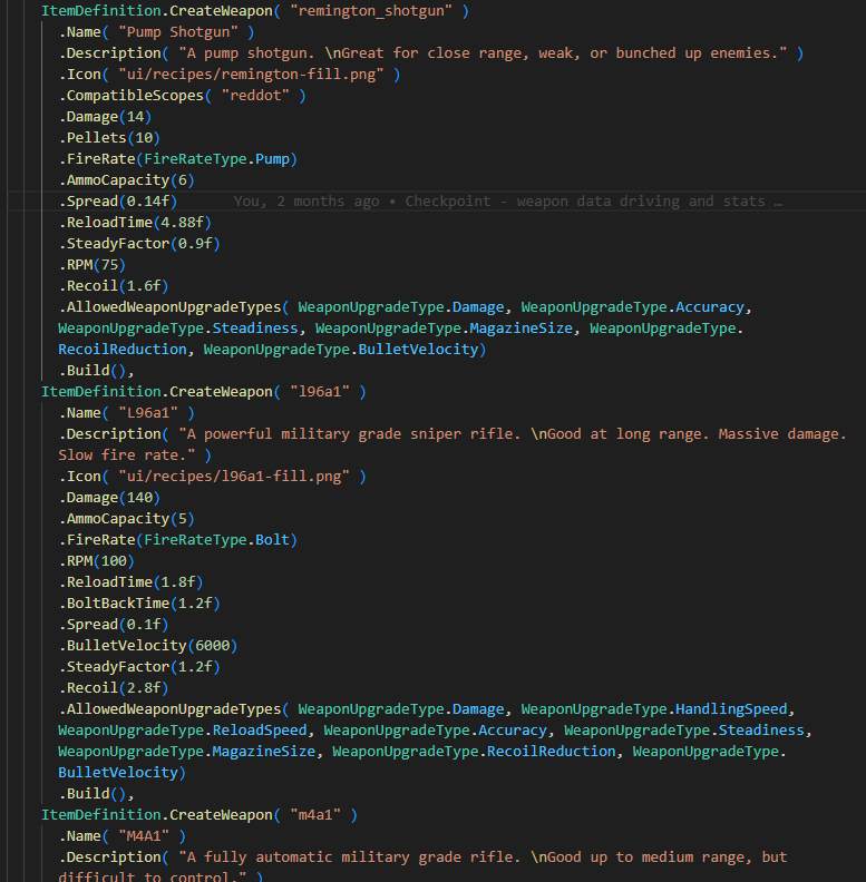 Essentially I could define weapon stats in code, but then whenever the weapon actually got created (ie we cloned the prefab) we overwrote the prefab values with the values I had in code. This was immensely helpful because balancing weapons became only a few button clicks, and even better was I could see all weapon settings next to each other at the same time.