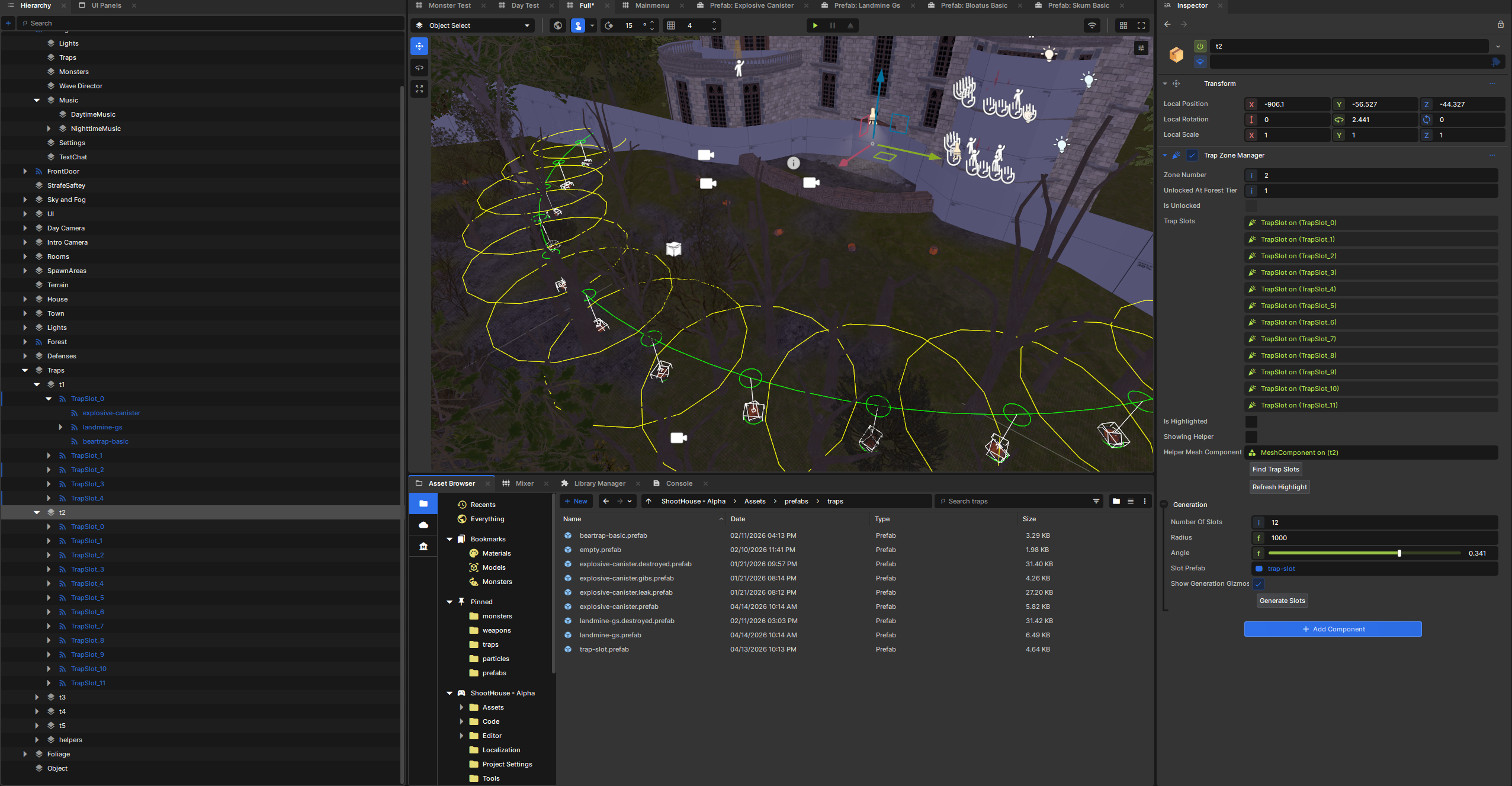 The property editor had a button "place traps" which would spawn an instance of each trap prefab, trace to the ground (where the trap should be placed), choose a random yaw rotation, and place the trap prefab. This place trap function was also triggered by the trap tier manager if it had just created a trap.