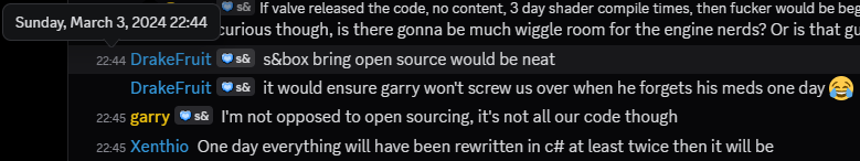 When Unity started their retroactive rent seeking campaign and Garry's Unity Can Get Fucked blog post came out I knew we were in for something much bigger. 3 years since that blog post and through some pretty horrific pains with Facepunch ripping out Source 2's entity system backbone, adding game objects in their stead, building the scene system, and overall completely redefining how development is done in this Engine, I'm blown away by the results and the progress that has been made. Even through dramatic changes like that, Open Sourcing the engine was one of the last things I ever expected to happen. And the idea started with a simple conversation on Discord.Congratulations to Facepunch and thanks for being so transparent and continuing to be so engaging with the community. Huge milestone.