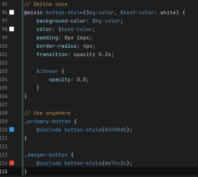 Mixins let you define reusable style templates that can be included anywhere in your stylesheets. They accept parameters, support nested selectors, and can even use @content blocks for wrapping patterns, dramatically reducing repetition and making your UI code easier to maintain.