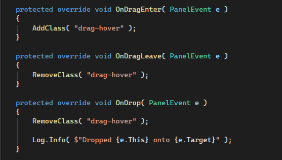 Improved UI drag & drop — new OnDragEnter, OnDragLeave, and OnDrop panel events matching standard web behaviour