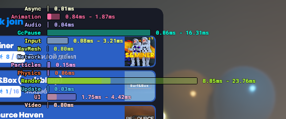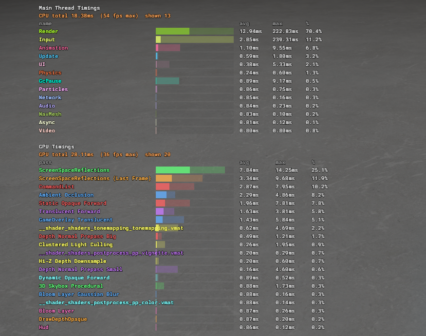 We've really been hacking away at optimizations; UI has always been a pain point and shifting it to command lists and multi-threading it is a big step forward; we've been drastically reducing allocations and continue to do so making less garbage meaning less hitches; as well as a lot of micro-optimizations that continue to add up week after week. And finally improving our overlays to better show and diagnose problems.