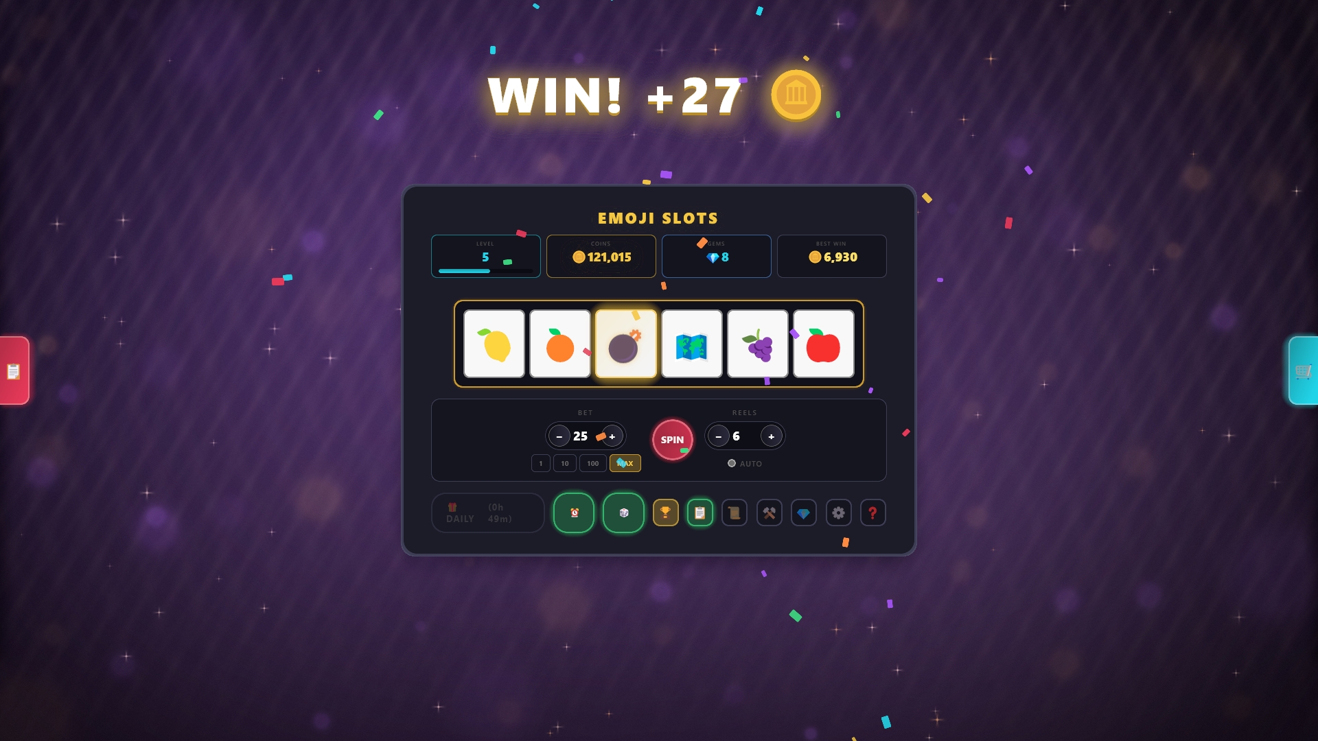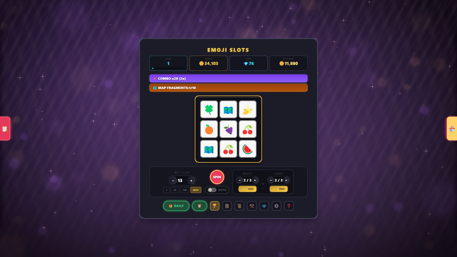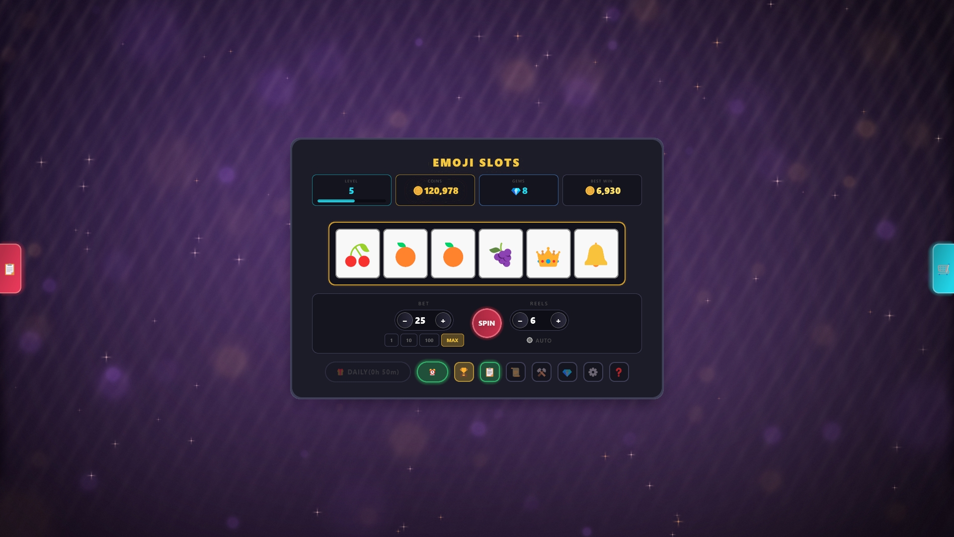 Spin the reels in this feature-packed slot machine experience! Match emojis anywhere on screen to win coins, then risk it all with the Double Up gamble or save up for powerful upgrades.
