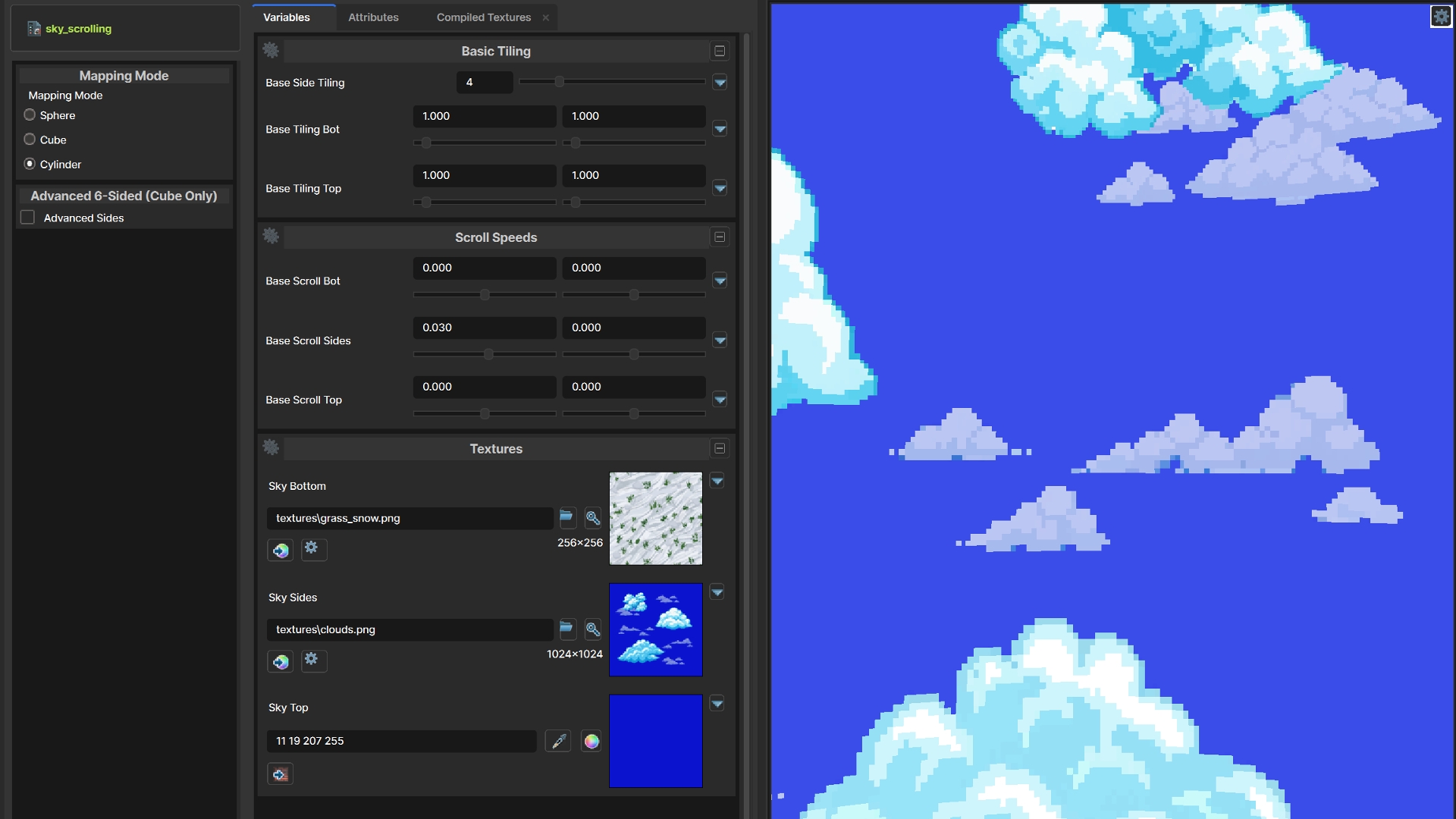 Lets you animate the sky by setting per-face scroll speed and tiling