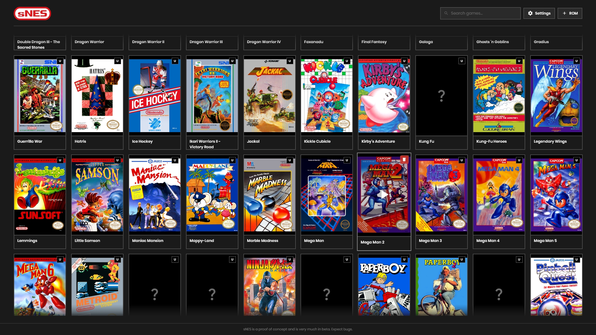 Subfolders are supported. Box art is fetched automatically from the libretro thumbnails database — use No-Intro filenames for best results (e.g. Tetris (USA).nes).