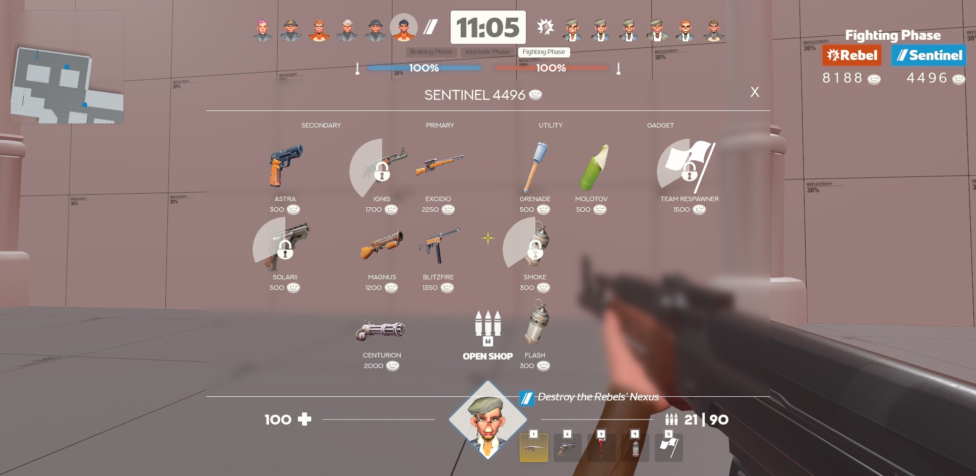 Gather resources, build your defenses, and smash the enemy base in a 6v6 FPS showdown!