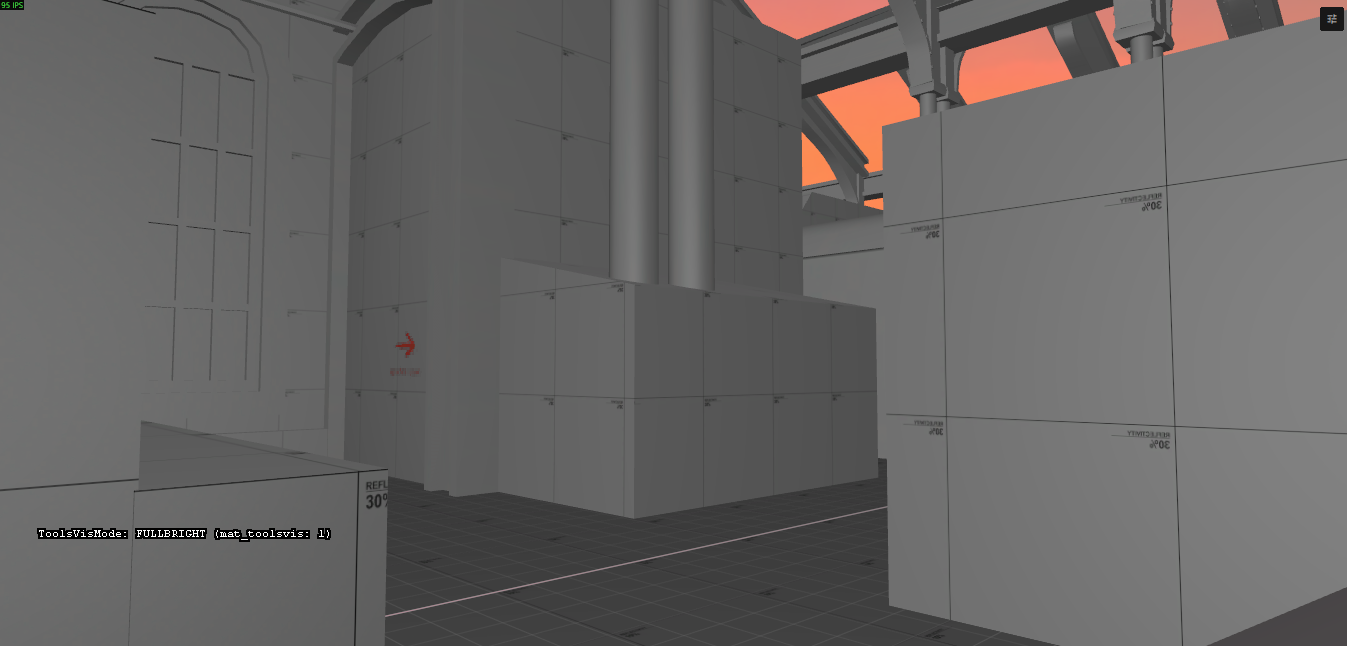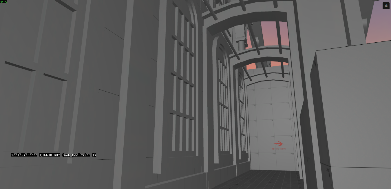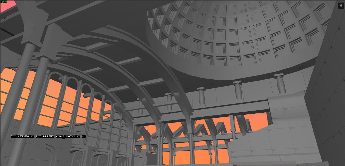 Iteration of primary shapes for the ceiling, exterior corridor, and a fix for a pillar issue in the middle of a corridor. The map remains in rough blockout and WIP.