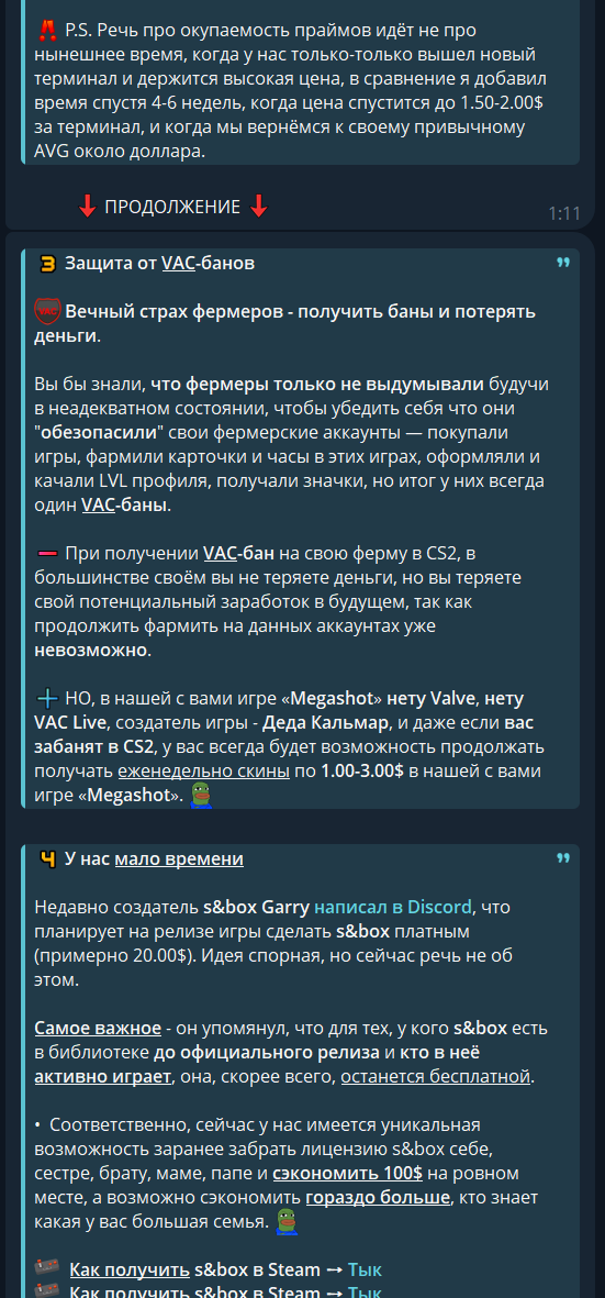 - I'm against this, and if I find out that the Megashot owners are doing this, I’ll report it to Facepunch and stop development. And right now everything is fine, the Megashot owners have no plans to do this and have even instructed their friends who own farms not to run bots on Megashot. We respect Facepunch and their products, and we adhere to all relevant rules