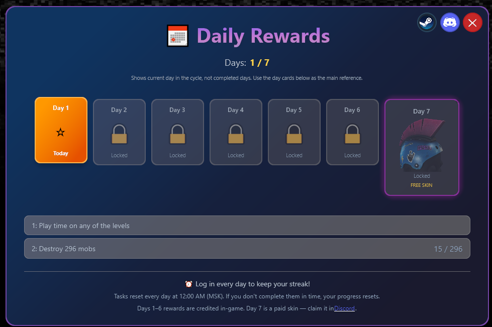For the past three days, I’ve been working intensively on Daily. I had to rewrite and rework a lot, but now everything should work perfectly. Time and frag count are now fully handled on the backend and should no longer reset. Don’t forget that at 12 AM Moscow time, Daily resets. Even if you are in the middle of completing it at that time but don’t finish, you will start again from day one.