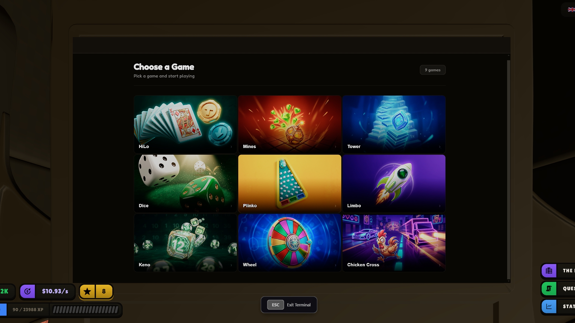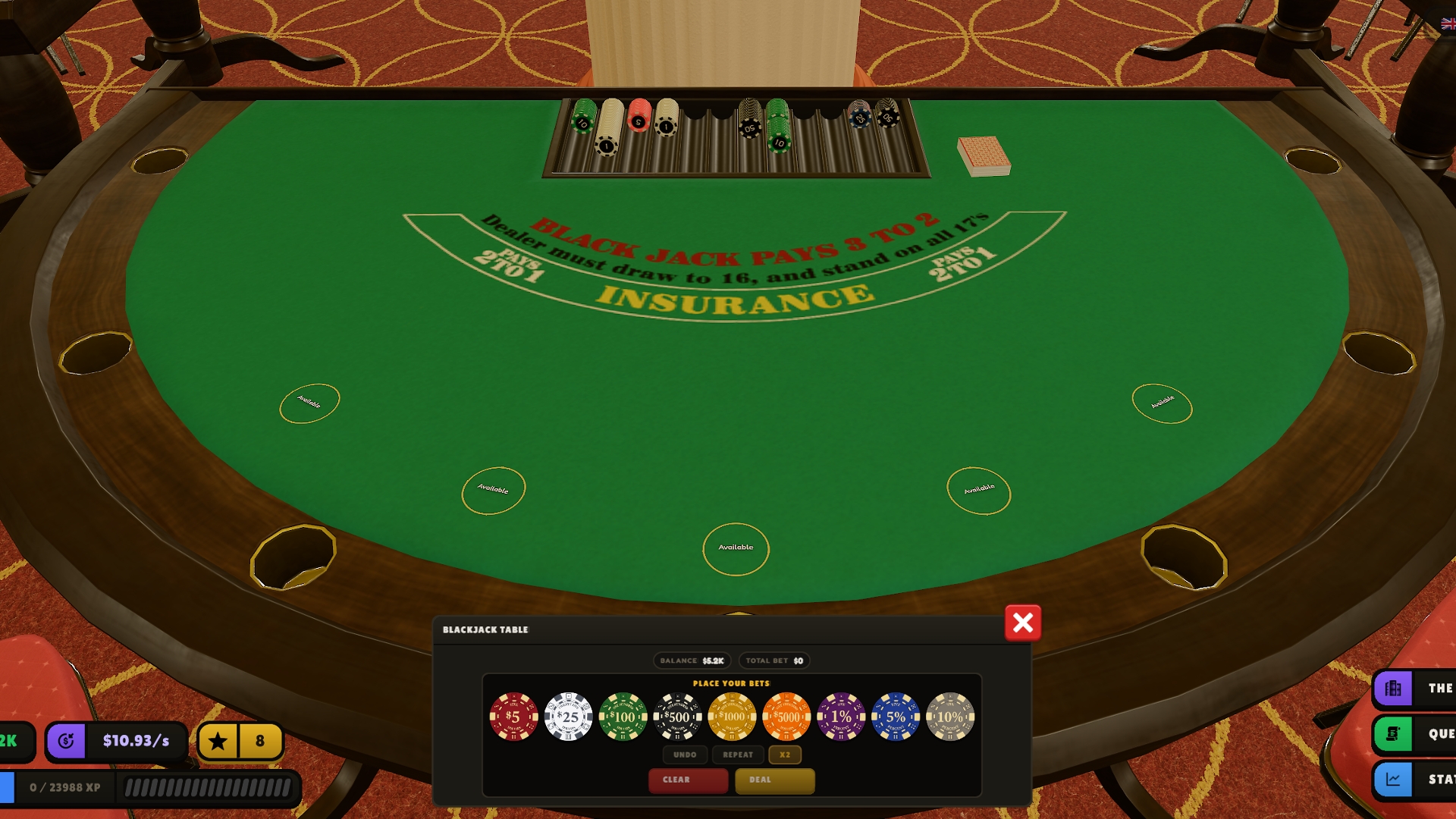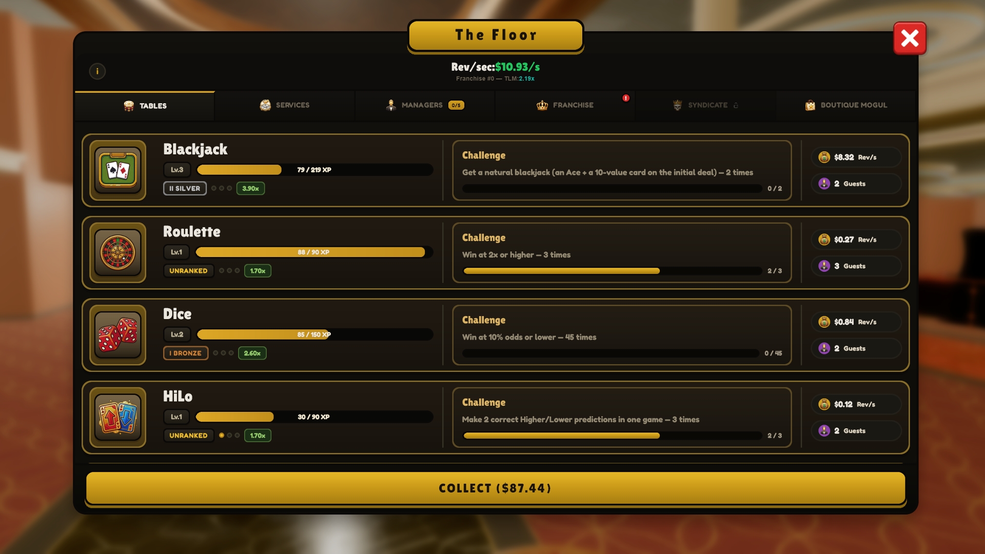 13 casino games. Multiplayer tables. An idle management layer. Prestige system with upgrades.