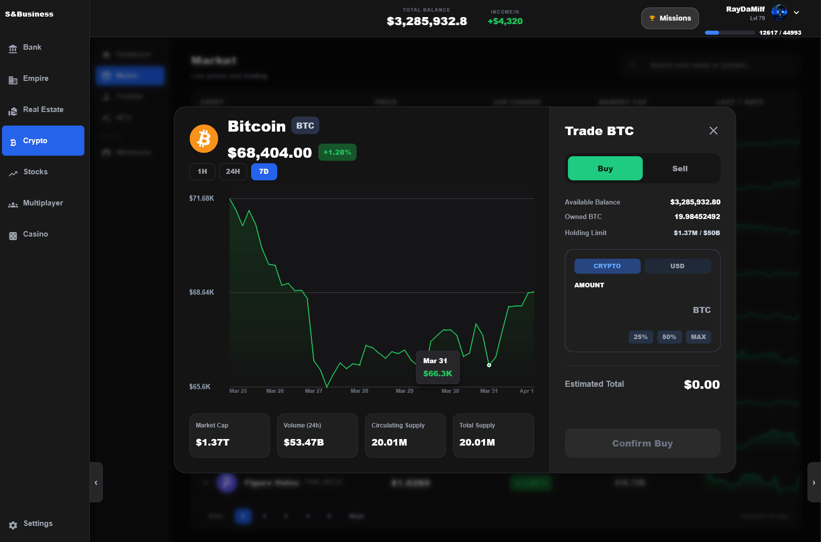 s&business is finaly back afther so long, now with new features but still many things that still need to return. ------------------------------------------------------------------------------------------------------------- - Investin real crypto --- all crypto prices are their real time value - invest in stocks - buy over 3 unique business - invest im real estate with over 40 houses - diferent cards = difenrent progress - much more