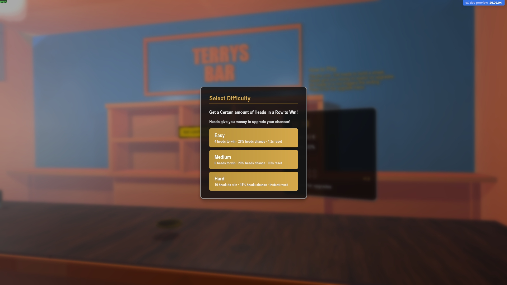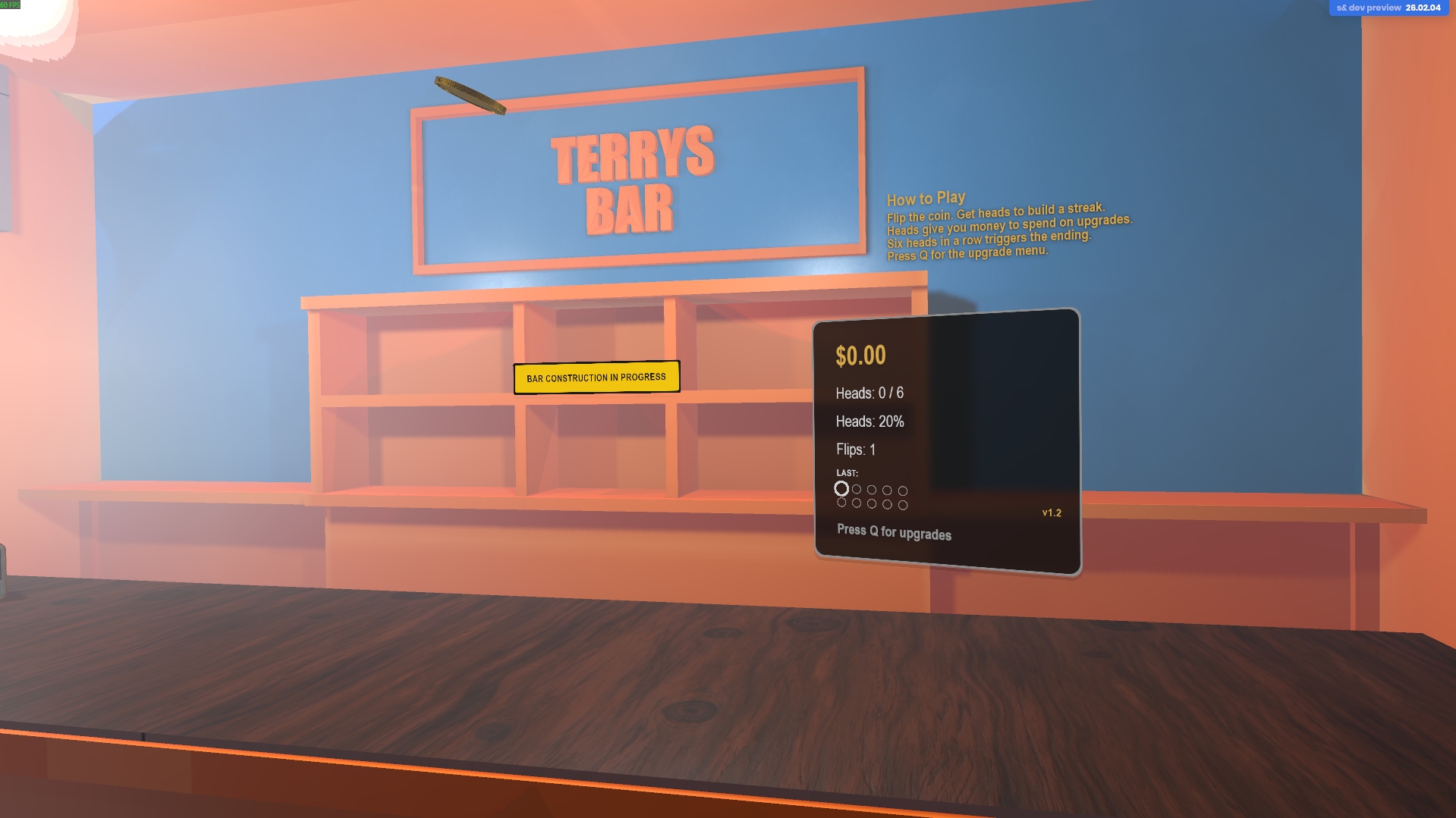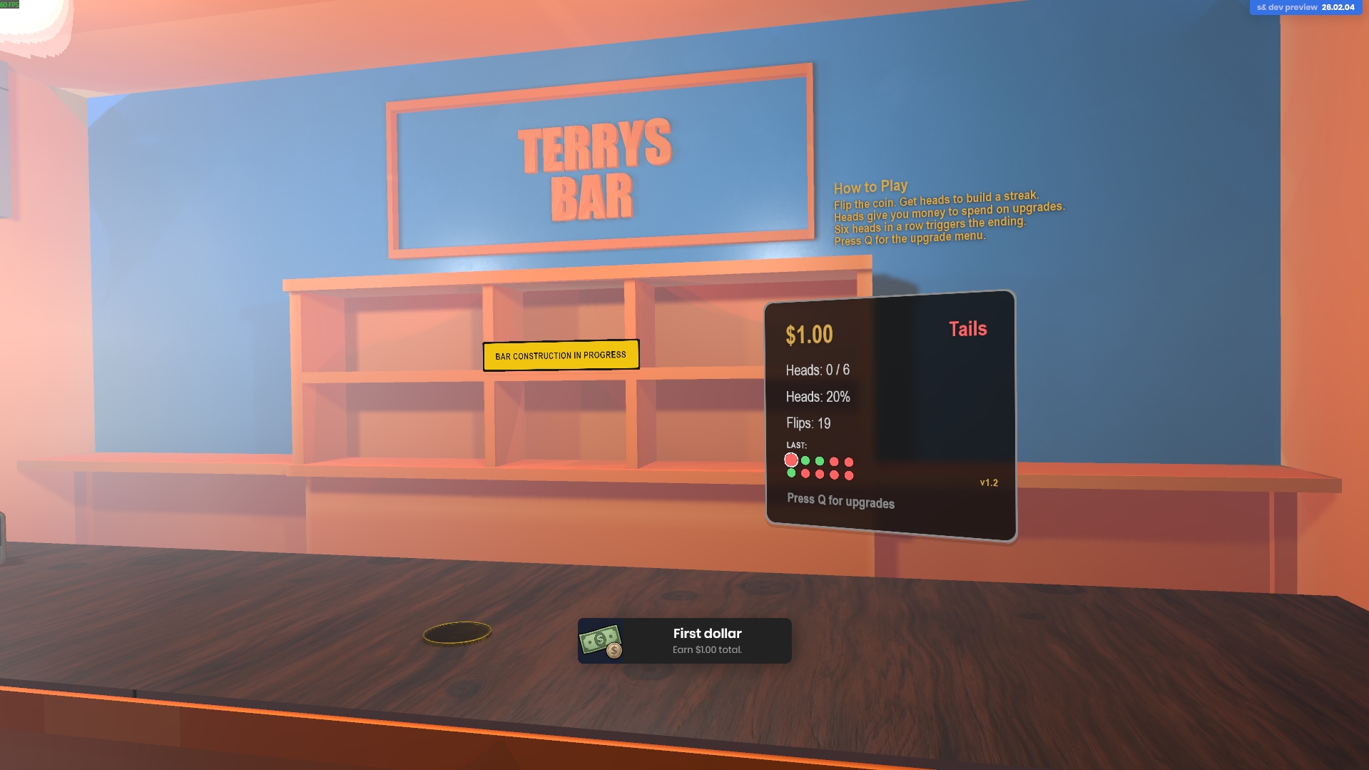 A bar. A coin. A streak and a Strategy. You buy upgrades with your winnings and keep flipping until the streak breaks or the night does. 10 Heads in a Row Wins! Upgrades increase the Odds.