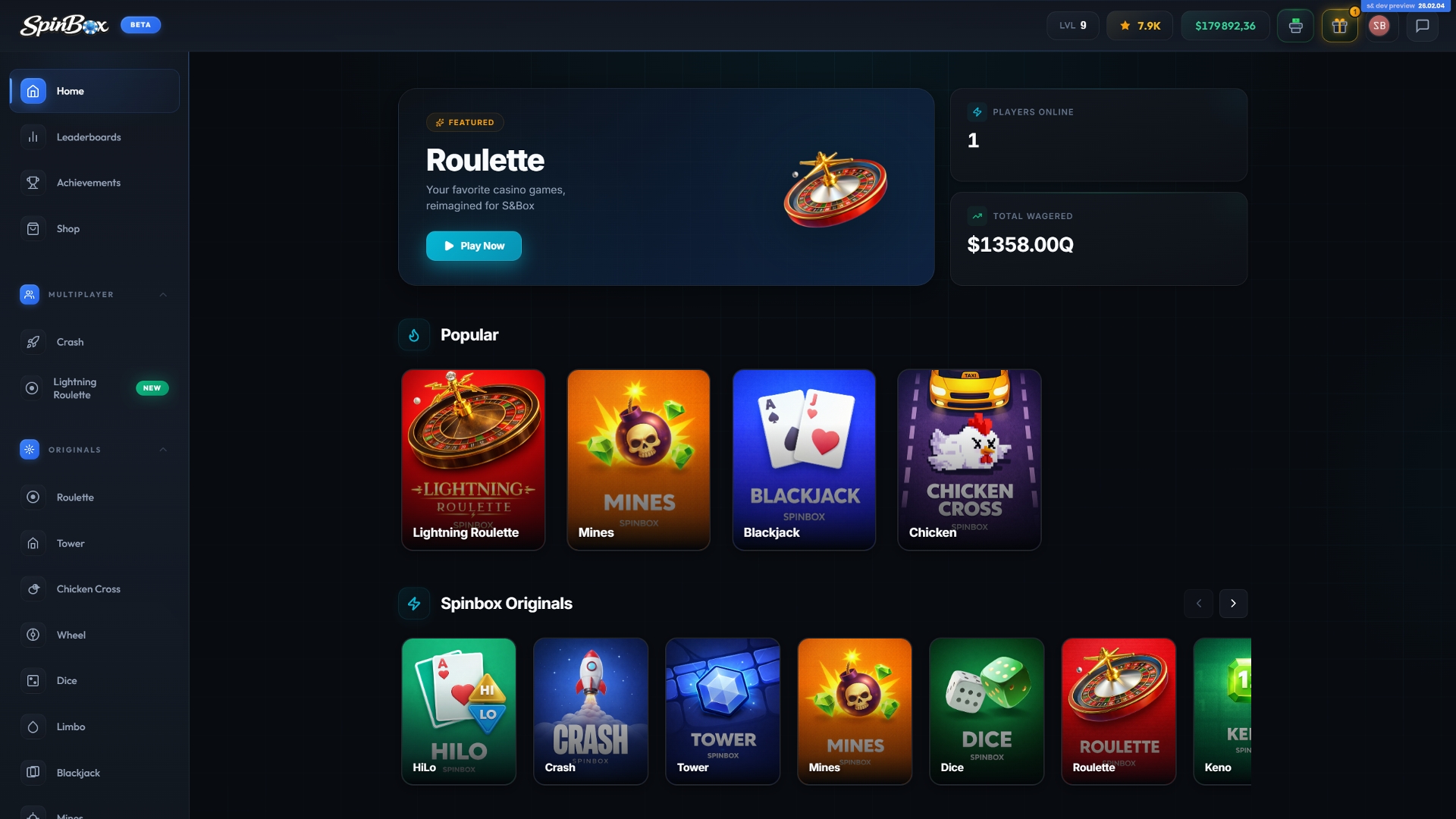 Spinbox is a casino platform featuring 10+ games, designed for both quick sessions and extended play. It offers a balanced mix of classic casino experiences and modern, fast-paced games, with more content actively in development and additional games coming soon.