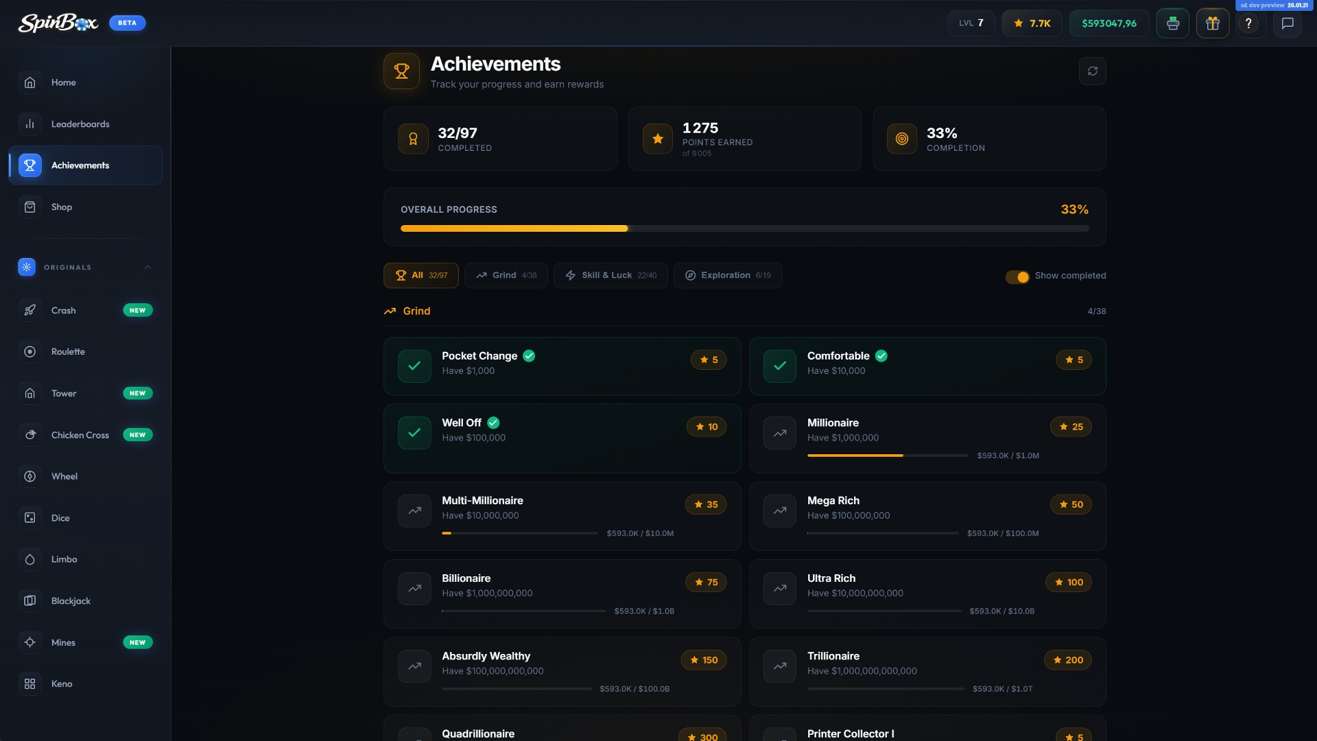 Spinbox includes a full progression system. Level up by playing games and collecting from your printer, earning points and cash bonuses along the way. Reaching milestones unlocks exclusive titles and borders. The printer generates passive income over time and can be upgraded to increase production, speed, and capacity.